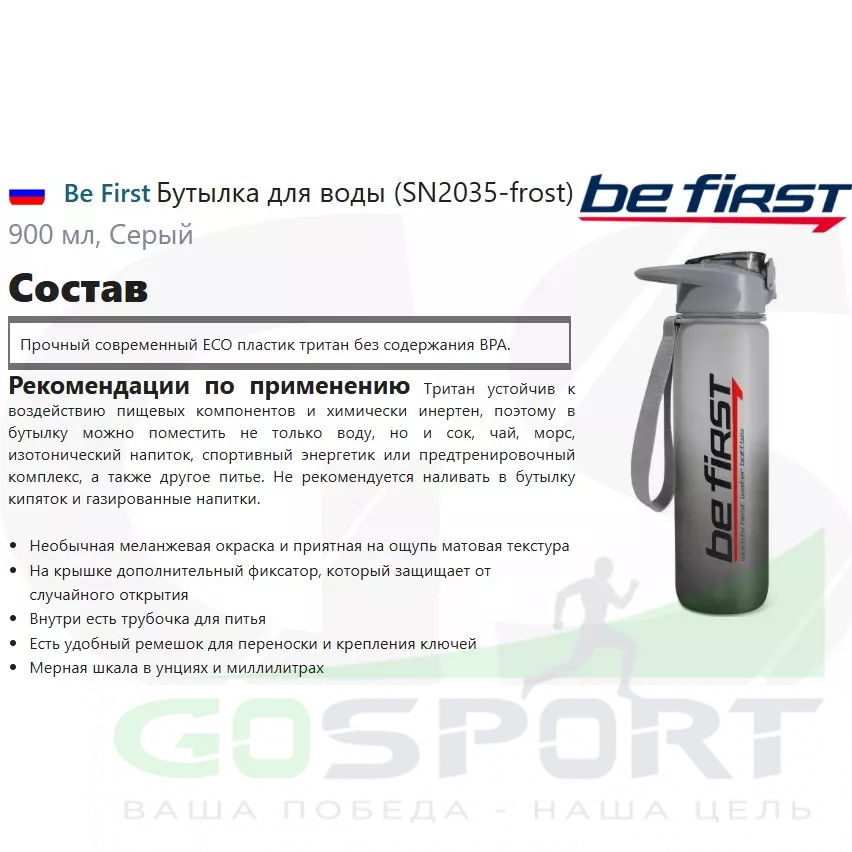 Be First Бутылка для воды (SN2035-frost) 900 мл, Серый — Удобная, герметичная, матовая