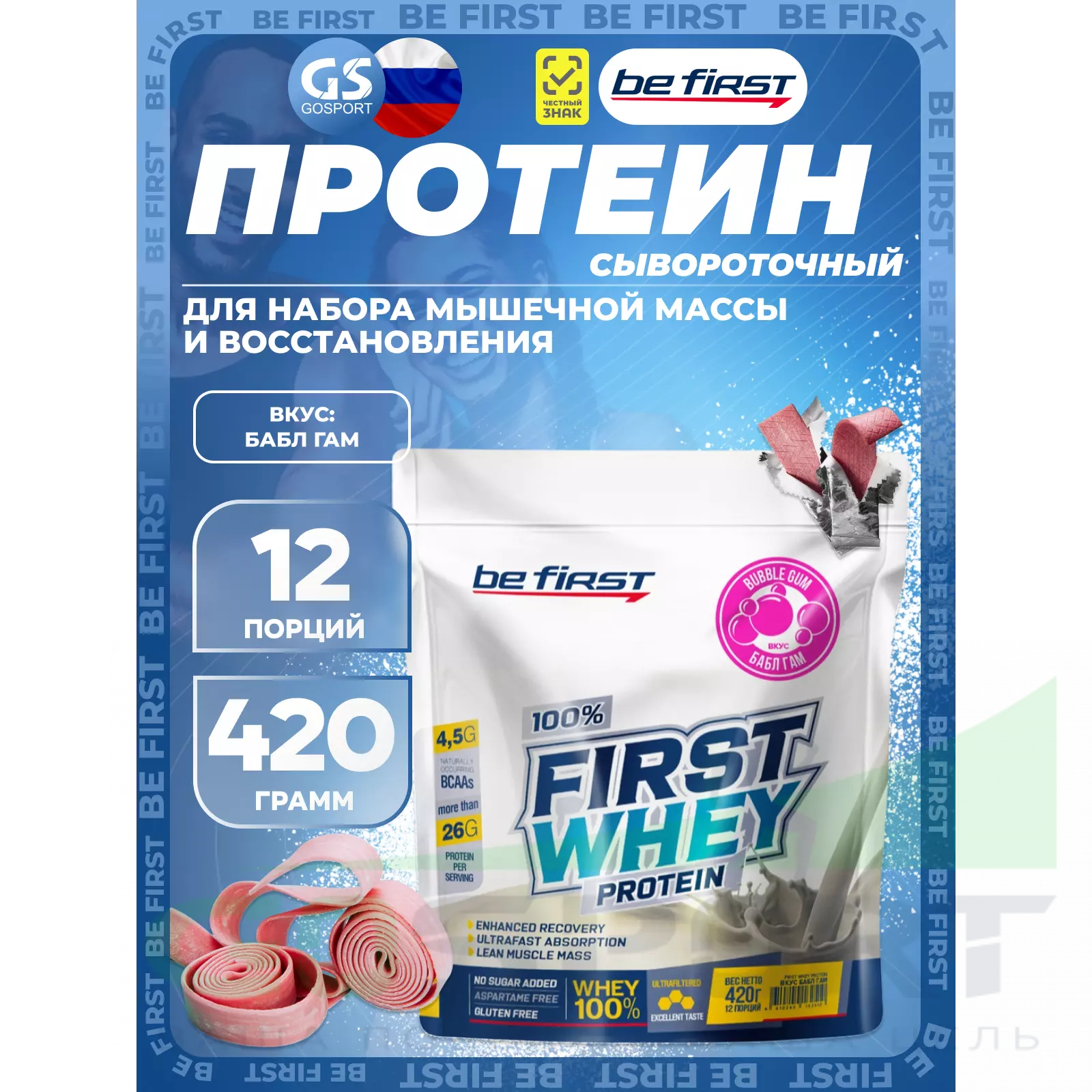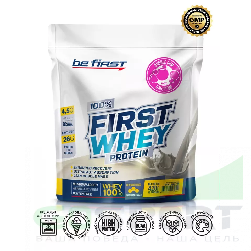 Be First First Whey protein (сывороточный протеин) 420 г, Бабл гам — Набор мышечной массы и восстановление