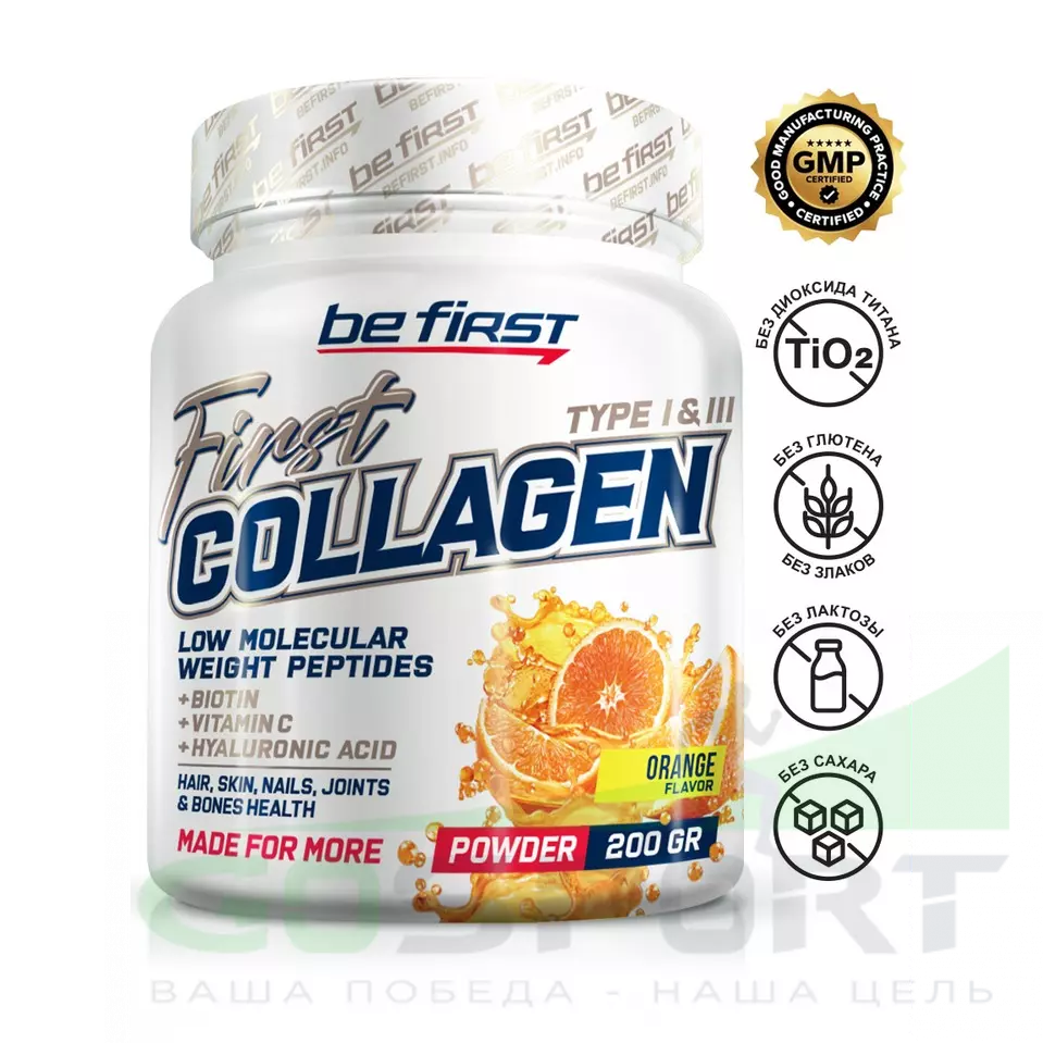 Be First First Collagen + biotin + hyaluronic acid + vitamin C 200 г, Апельсин — Поддержка суставов, связочного аппарата и кожи