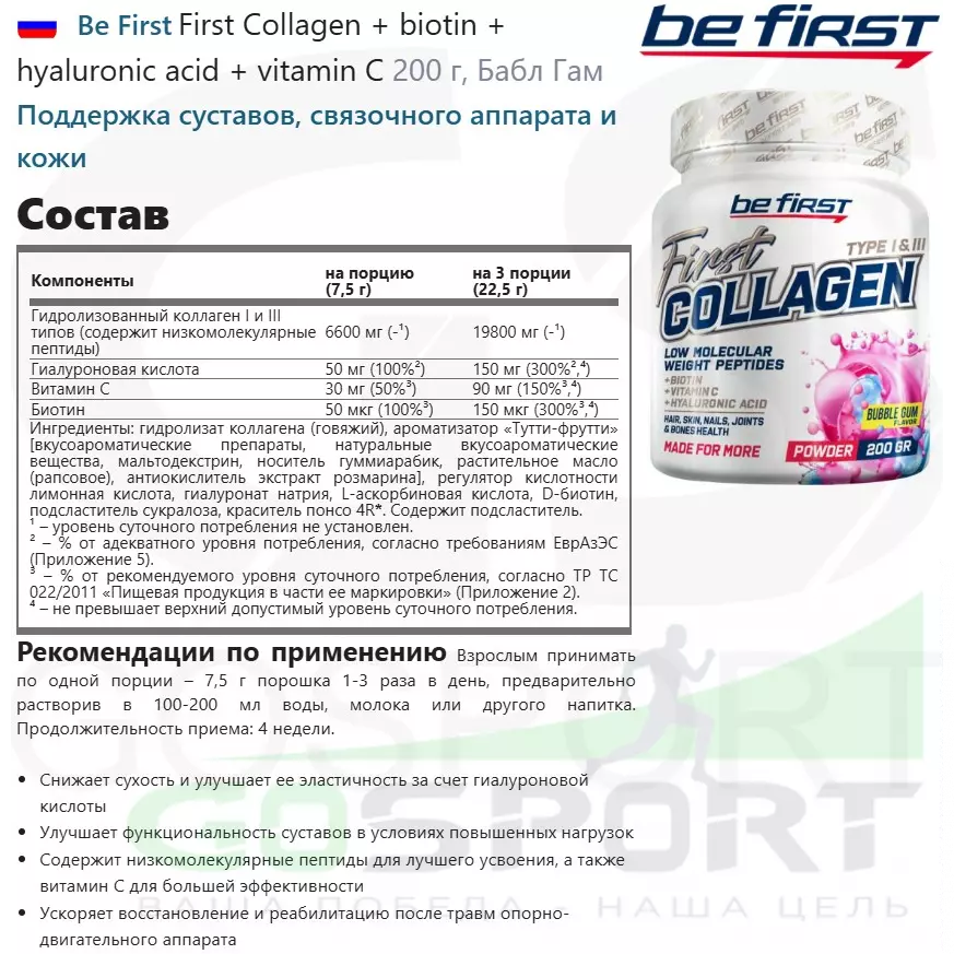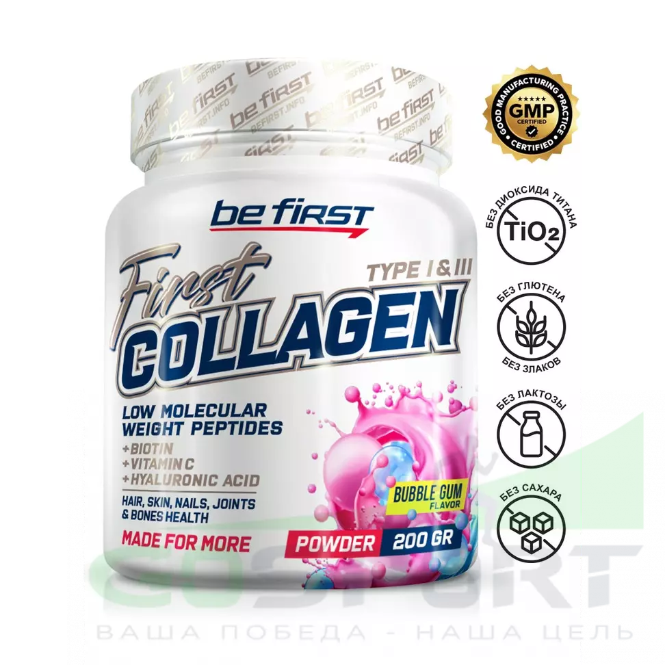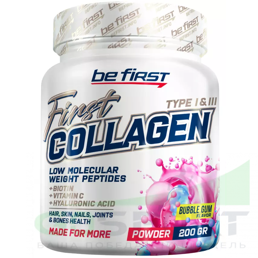 Be First First Collagen + biotin + hyaluronic acid + vitamin C 200 г, Бабл Гам — Поддержка суставов, связочного аппарата и кожи