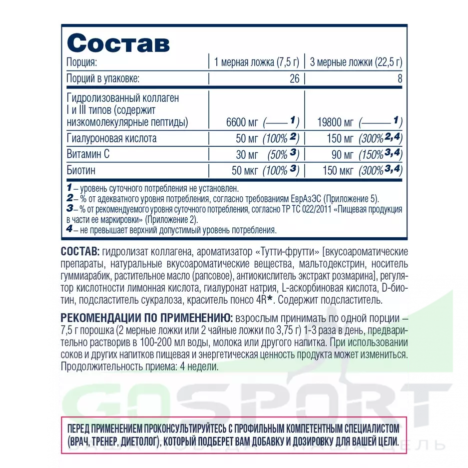 | Гидролизованный коллаген I и III типов | 5300 мг |