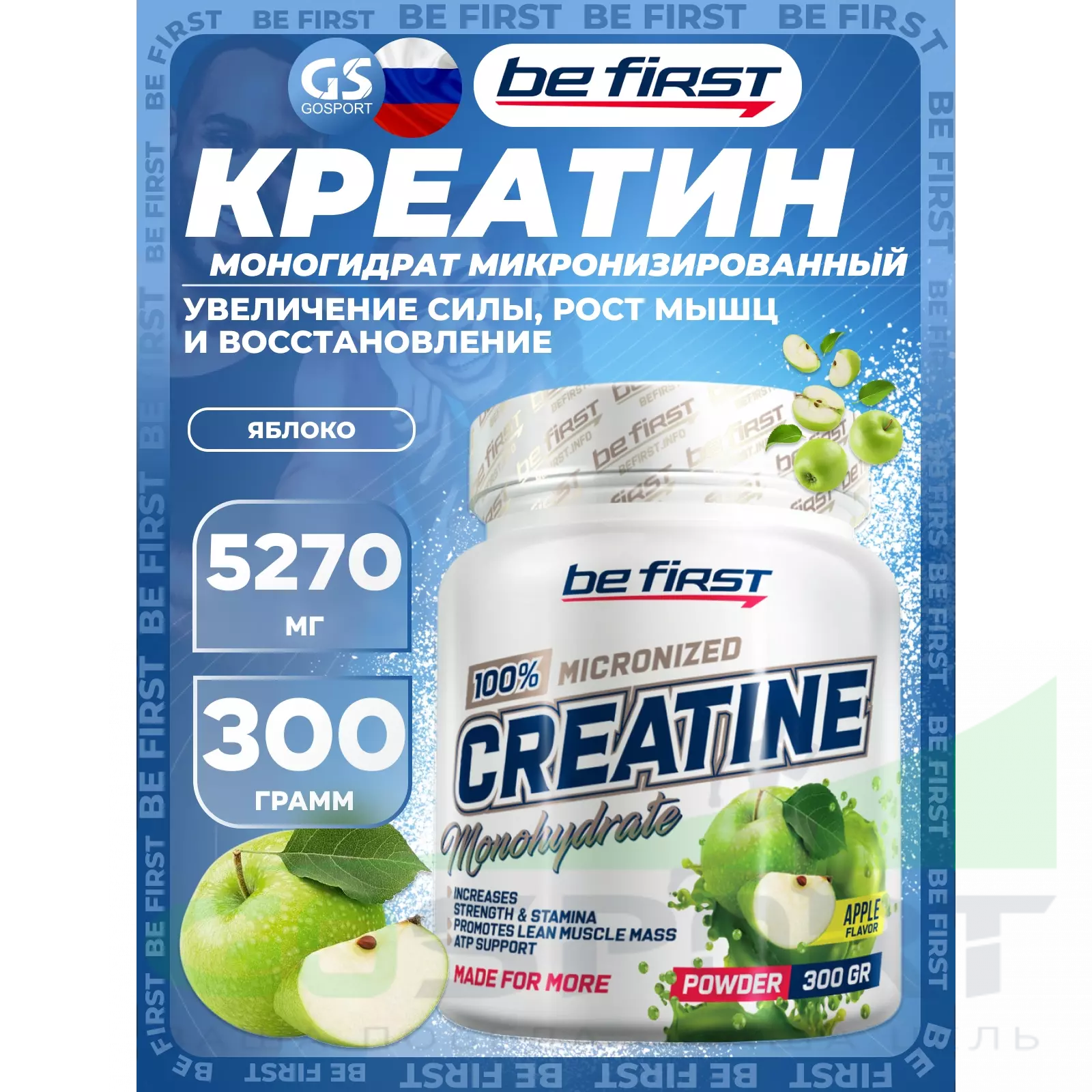 Be First Creatine Micronized Powder (креатин моногидрат) 300 г, Яблоко — Выносливость, сила и восстановление