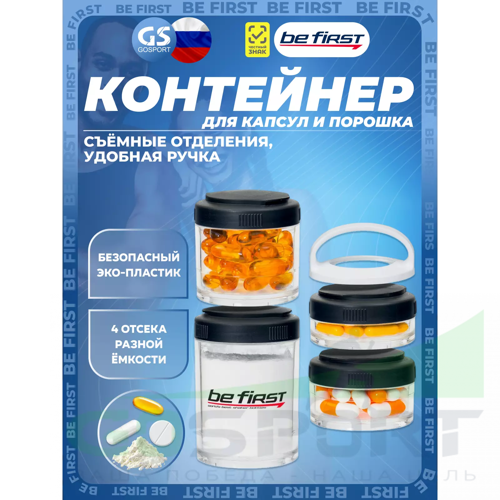 Компания Be First предлагает комплект контейнеров для хранения капсул или порошков. В комплект входит 4 контейнера разной емкости. На завинчивающихся крышках и в донышках сделаны специальные крепления, позволяющие соединять контейнеры между собой в любом порядке. При этом образуется компактный кейс, легко помещающийся в карман сумки или куртки. Можно взять с собой на тренировку только один контейнер, или 2, или 3, или все четыре. К верхнему контейнеру в комплекте можно присоединить ручку, которая делает использование контейнеров еще более удобным.