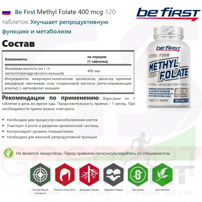 Be First Methyl Folate 400 mcg 120 таблеток — Улучшает репродуктивную функцию и метаболизм