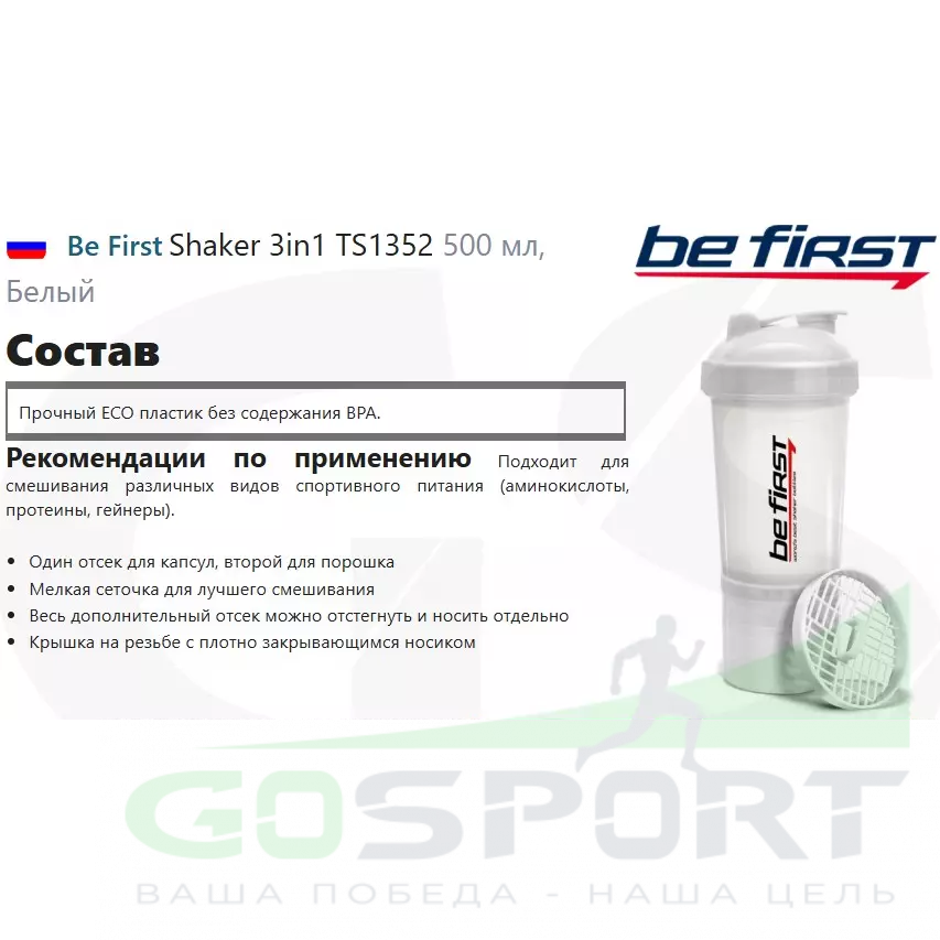 Спортивный шейкер Be First 500 мл 3-в-1 подойдет от аминокислотных до протеиновых коктейлей и гейнеров, которые помогут Вам подготовиться к тренировке, пополнив запасы аминокислот, а также быстрее восстановить силы после нагрузки. Сетка с небольшими узкими отверстиями способствует лучшему смешиванию однородного коктейля без комочков. Крышка на резьбе, плотно закрывающийся питьевой носик, отсутствующие внутри выступы – все продумано для более удобного использования шейкера.