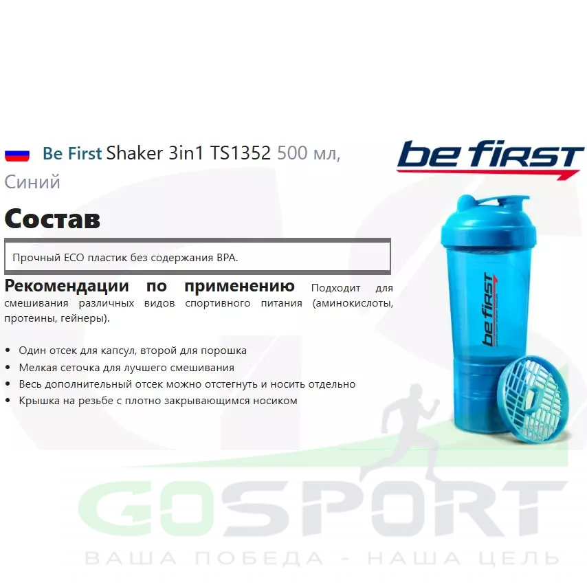 Спортивный шейкер Be First 500 мл 3-в-1 подойдет от аминокислотных до протеиновых коктейлей и гейнеров, которые помогут Вам подготовиться к тренировке, пополнив запасы аминокислот, а также быстрее восстановить силы после нагрузки. Сетка с небольшими узкими отверстиями способствует лучшему смешиванию однородного коктейля без комочков. Крышка на резьбе, плотно закрывающийся питьевой носик, отсутствующие внутри выступы – все продумано для более удобного использования шейкера.