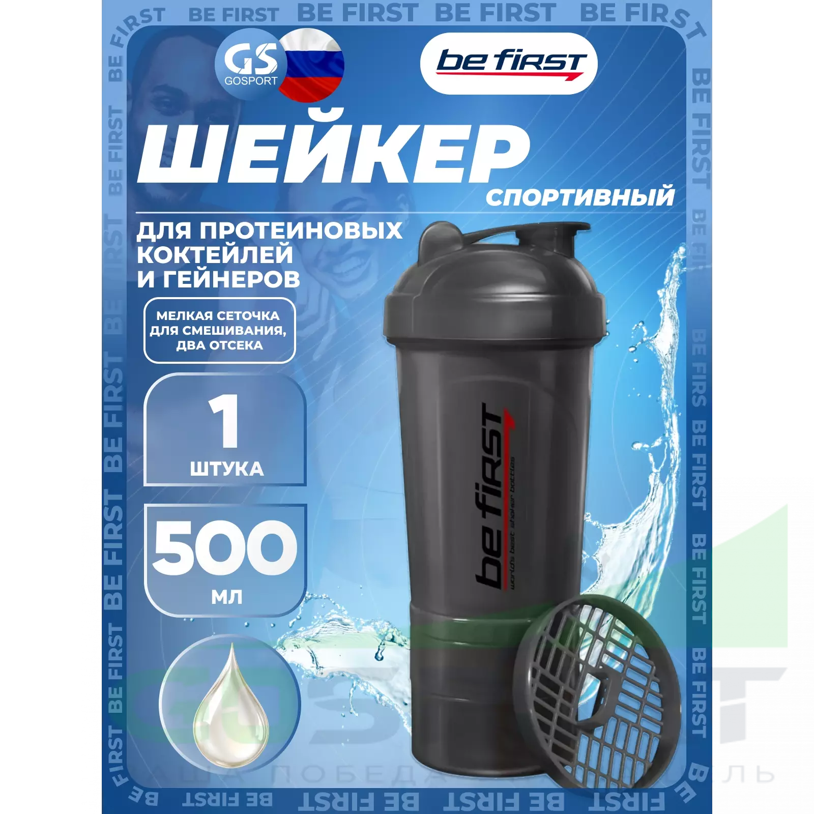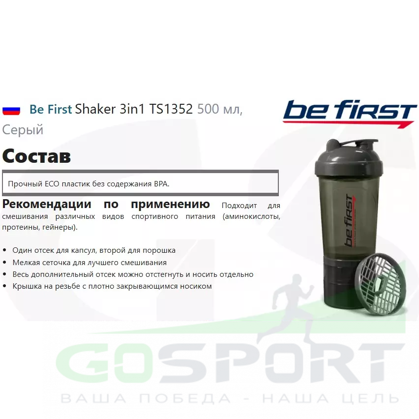 Спортивный шейкер Be First 500 мл 3-в-1 подойдет от аминокислотных до протеиновых коктейлей и гейнеров, которые помогут Вам подготовиться к тренировке, пополнив запасы аминокислот, а также быстрее восстановить силы после нагрузки. Сетка с небольшими узкими отверстиями способствует лучшему смешиванию однородного коктейля без комочков. Крышка на резьбе, плотно закрывающийся питьевой носик, отсутствующие внутри выступы – все продумано для более удобного использования шейкера.
