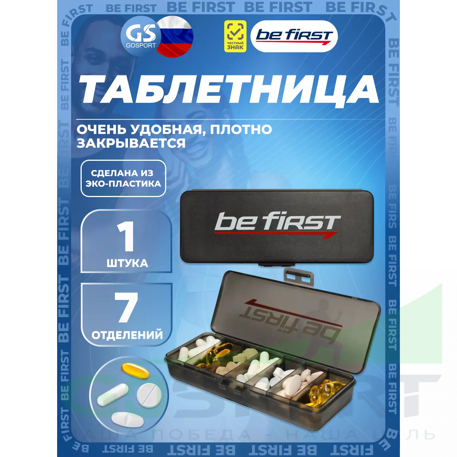 Таблетница компании Be First является очень удобным аксессуаром для всех, кто принимает различные препараты — витамины, лекарства, капсулированные добавки и т.п. В таблетнице их удобно взять с собой на тренировку или в поездку, зная, что ничего не рассыплется, не потеряется и не перепутается. Все таблетницы делаются из экологичного пищевого пластика BPA & DEHP FREE. Данная таблетница имеет внутри 7 отделений — можно взять 7 препаратов, или разделить один на 7 приемов, к примеру, по дням недели. Имеются черные, белые и прозрачные таблетницы. Крышка закрывается плотно и язычок удерживается двумя выступами, что исключает случайное открывание.