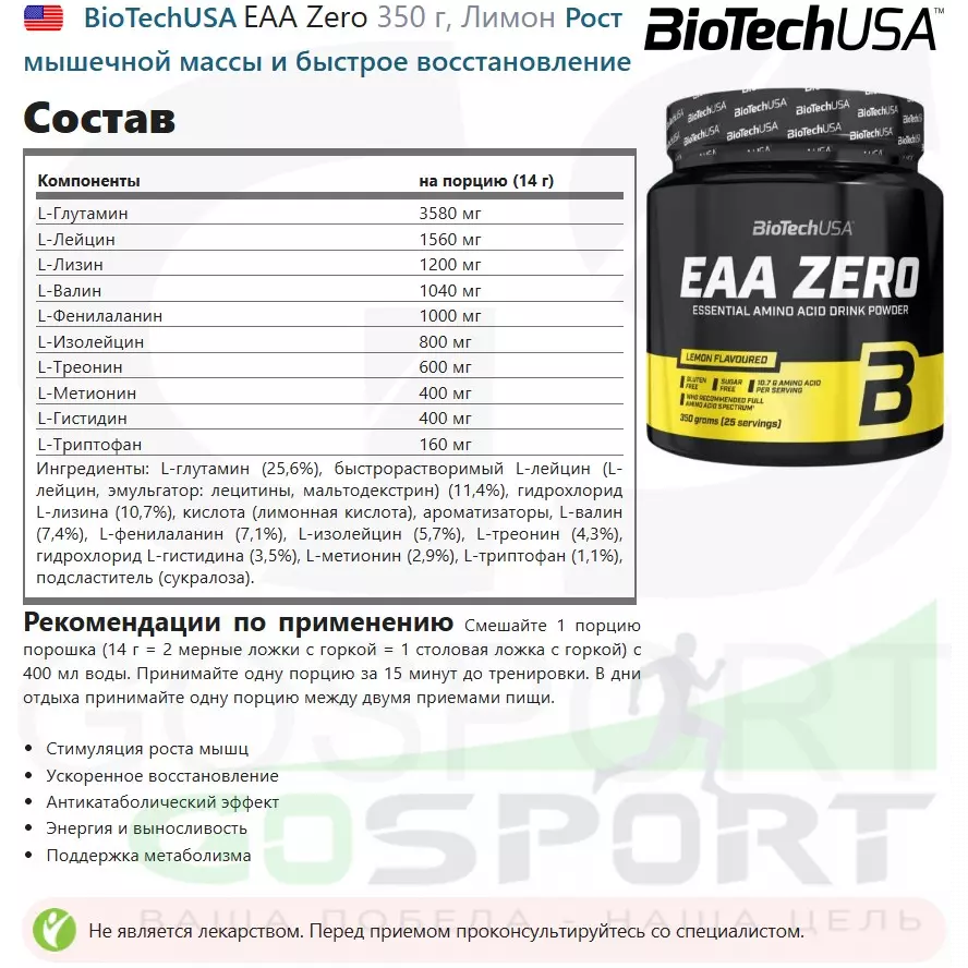 Аминокислотный комплекс BioTech EAA Zero создан для поддержания ваших мышц. Одна порция на 50% удовлетворяет суточную потребность человека в аминокислотах. И это особенно важно при интенсивных тренировках, когда требуется запустить процесс рост мышц и сформировать для них мощную защиту.
