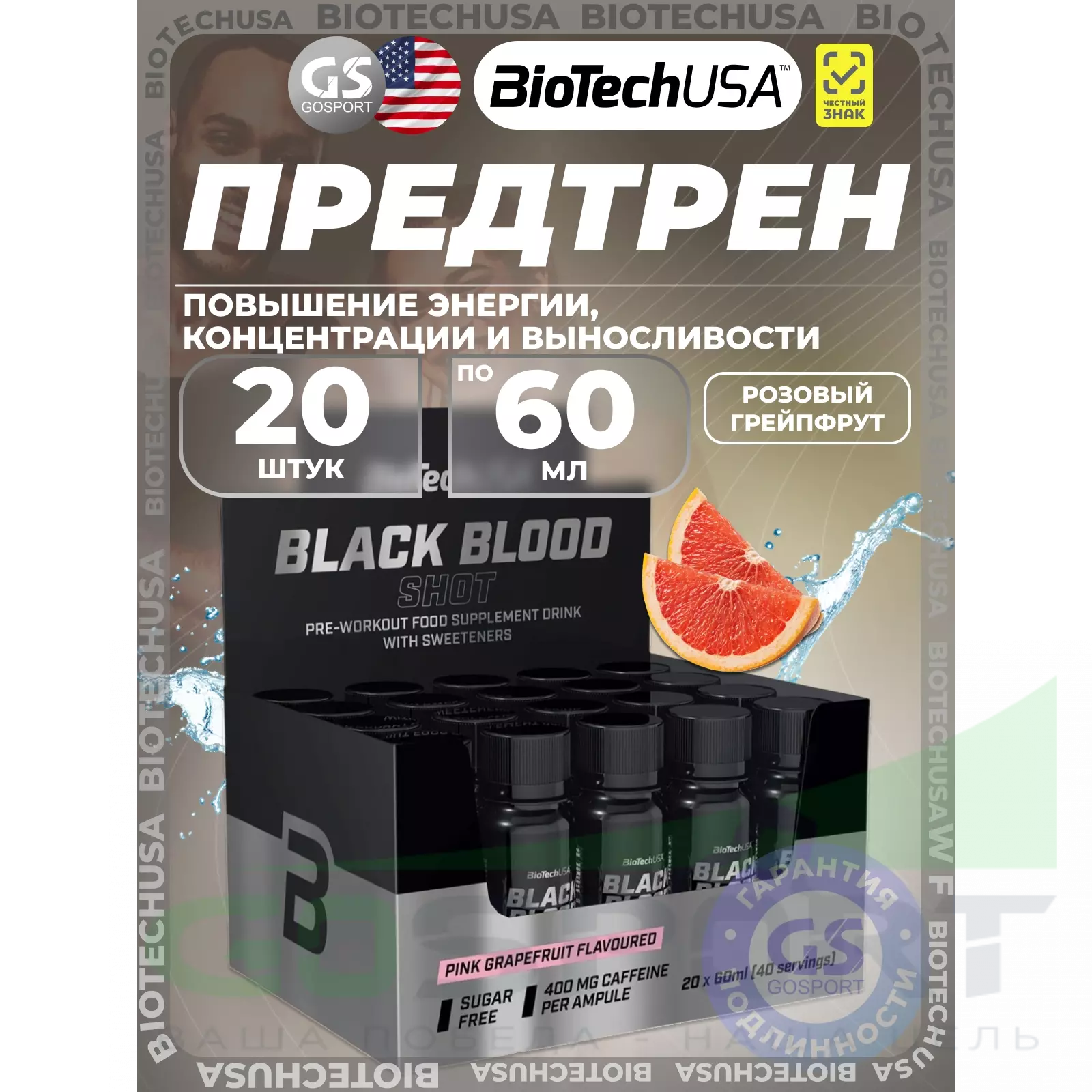 BioTechUSA Black blood Shot 20 х 60 мл, Розовый грейпфрут — Повышении энергии, концентрации и выносливости