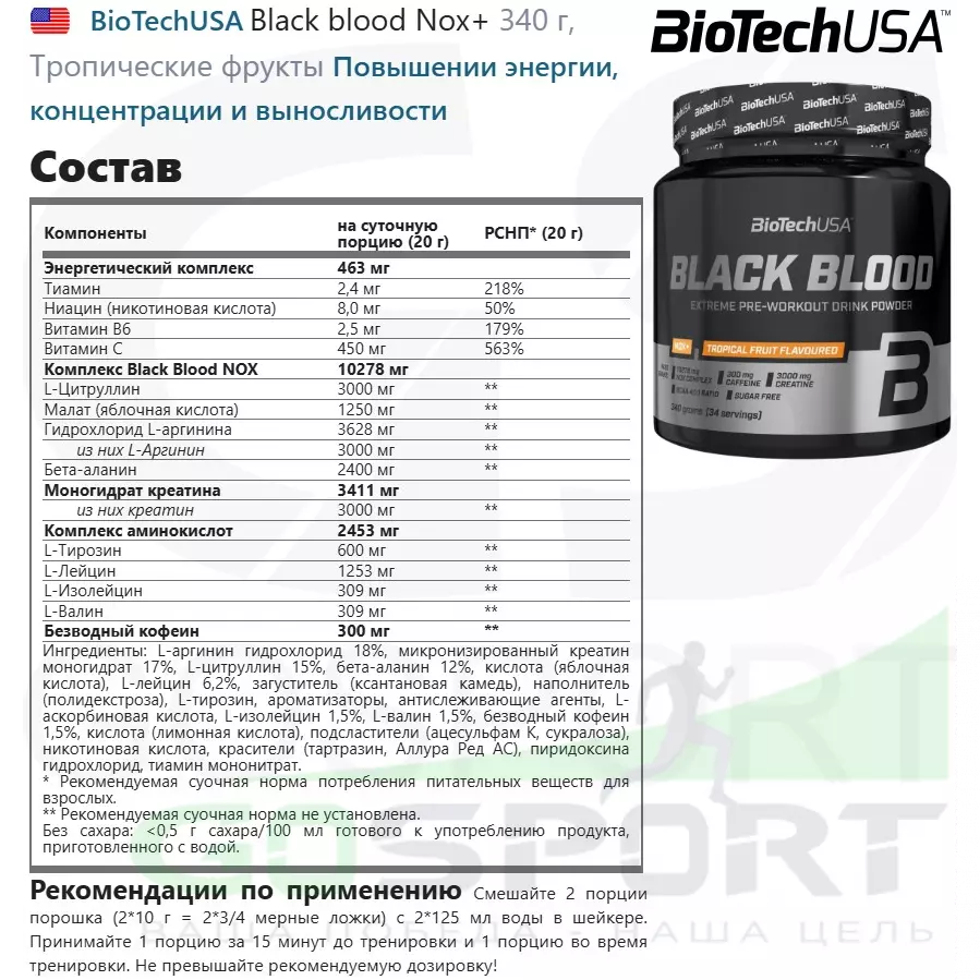 Если вы стремитесь достичь высоких результатов в тренировках, бустер Black Blood CAF+ станет вашим верным помощником как для мужчин, так и для женщин. Он создан для спортсменов, которые хотят максимально раскрыть свой потенциал и обеспечить себе мощный заряд энергии перед каждой тренировкой. Спортивное питание BiotechUSA – поднимите свои тренировки на новый уровень с мощью Black Blood CAF+.