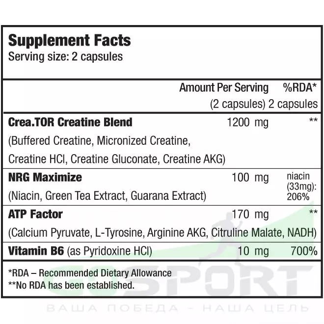 | Ингредиенты: микронизированный креатин моногидрат 43%, буферизированный креатин моногидрат 9% (микронизированный креатин моногидрат, магния оксид), креатин пируват 9% (микронизированный креатин моногидрат, кальция пируват), креатин цитрат 9% (микронизированный креатин моногидрат, соли кальция лимонной кислоты), L-лейцин, L-аргинин гидрохлорид, L-аргинин альфа-кетоглутарат, L-цитруллин, L-тирозин, никотиновая кислота (0,4%), пиридоксин гидрохлорид (0,05%), оболочка капсулы (желатин, очищенная вода, красители (диоксид титана, оксиды и гидроксиды железа)), антислеживающий агент (магния соли жирных кислот, диоксид кремния). | |