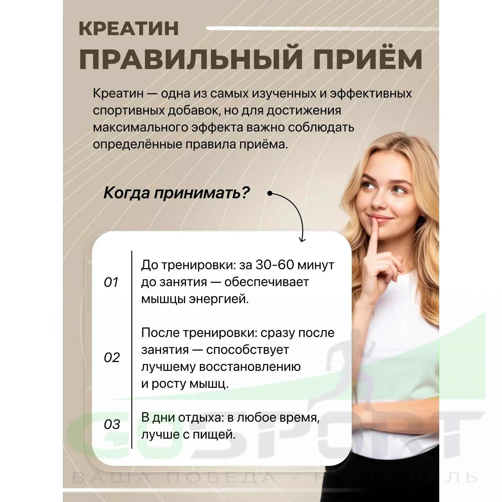 Для приготовления продукта смешайте 3,4 грамма порошка с 200-250 мл прохладной воды или же любого другого напитка на ваше усмотрение. Креатин моногидрат отлично сочетается в одном коктейле с таким спортивным питанием, как протеиновые и белково-углеводные напитки.