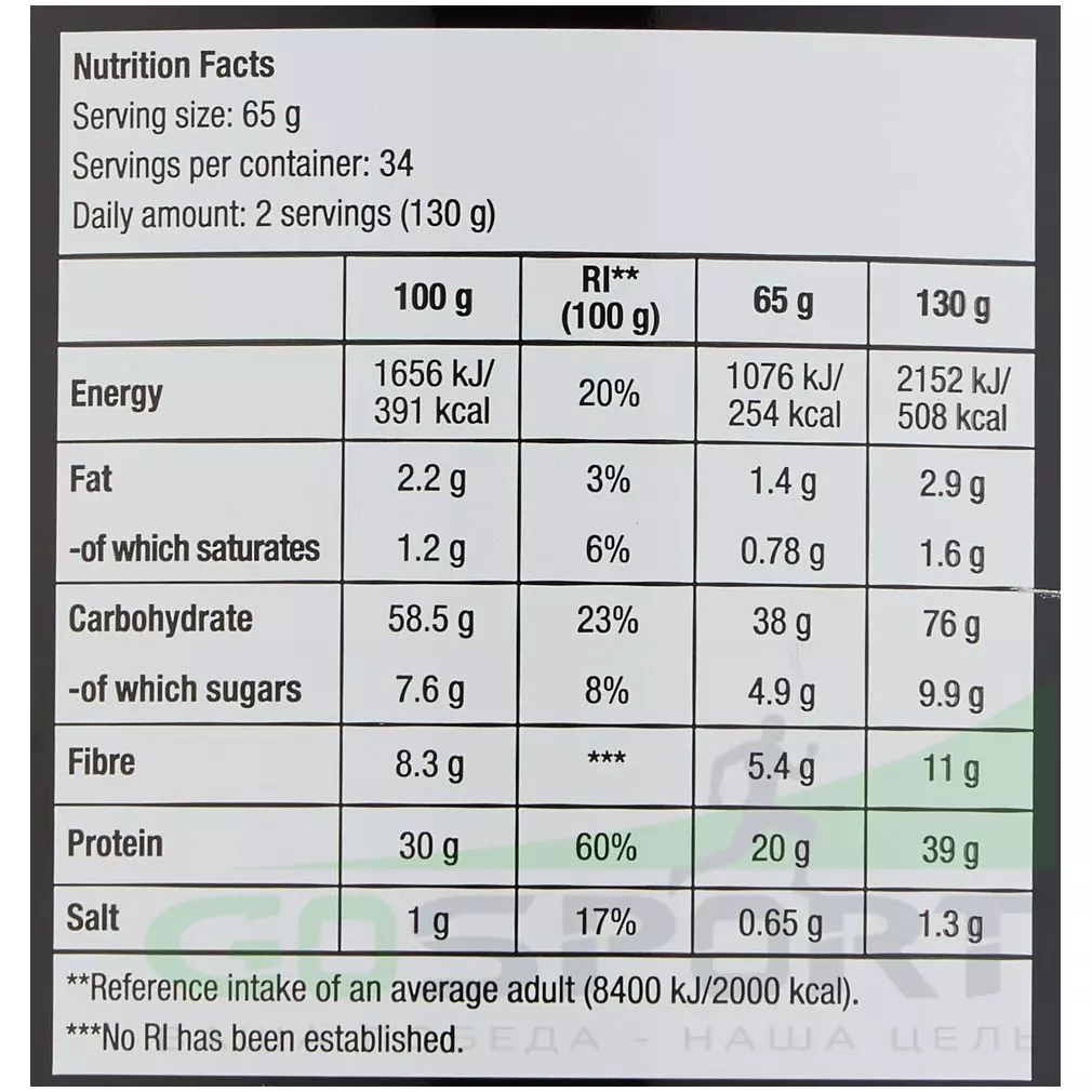 | Другие ингредиенты: CarboHEX 64,1% (мальтодекстрин, декстроза, фруктоза, кукурузный крахмал, палатиноза*, инулин), белковый комплекс 25,8% (ультрафильтрованный концентрат сывороточного протеина, холодной фильтрации изолят сывороточного протеина, концентрат молочного протеина, гидролизованные сывороточные пептиды, казеинат кальция), многофазная креатиновая матрица 7,2% (микронизированный креатин моногидрат, CreaBASE буферный креатин, креатин пируват, креатин цитрат), ароматизатор, LipoFusion 1% (среднецепочечные триглицериды из кокосового и пальмового масла, CLA из подсолнечного масла, конъюгированная линолевая кислота из подсолнечного масла, льняное масло), загуститель (карбоксиметил целлюлоза), вещества, предотвращающие слипание (кальция фосфат), краситель (куркумин), подсластитель (сукралоза). *Палатиноза = Изомальтулоза. Изомальтулоза является источником глюкозы и фруктозы. | |