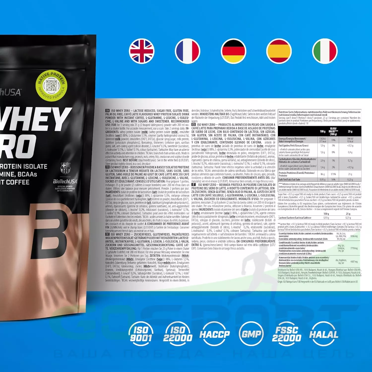 Высококачественный порошок из изолята сывороточного протеина, с пониженным содержанием лактозы, с добавлением аминокислот BCAA и глютамина.