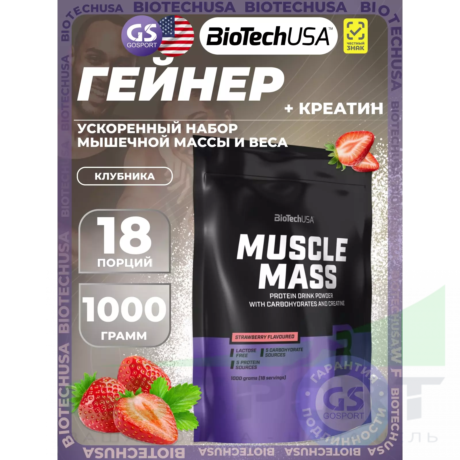 BioTechUSA Muscle Mass 1000 г, Клубника — Набор мышечной массы, энергия и восстановление