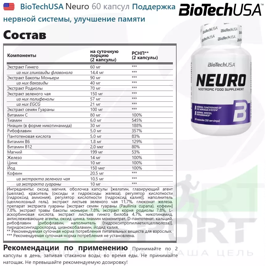 Как и вся продукция BioTechUSA, капсулы Neuro состоят из безопасных и тщательно отобранных ингредиентов.