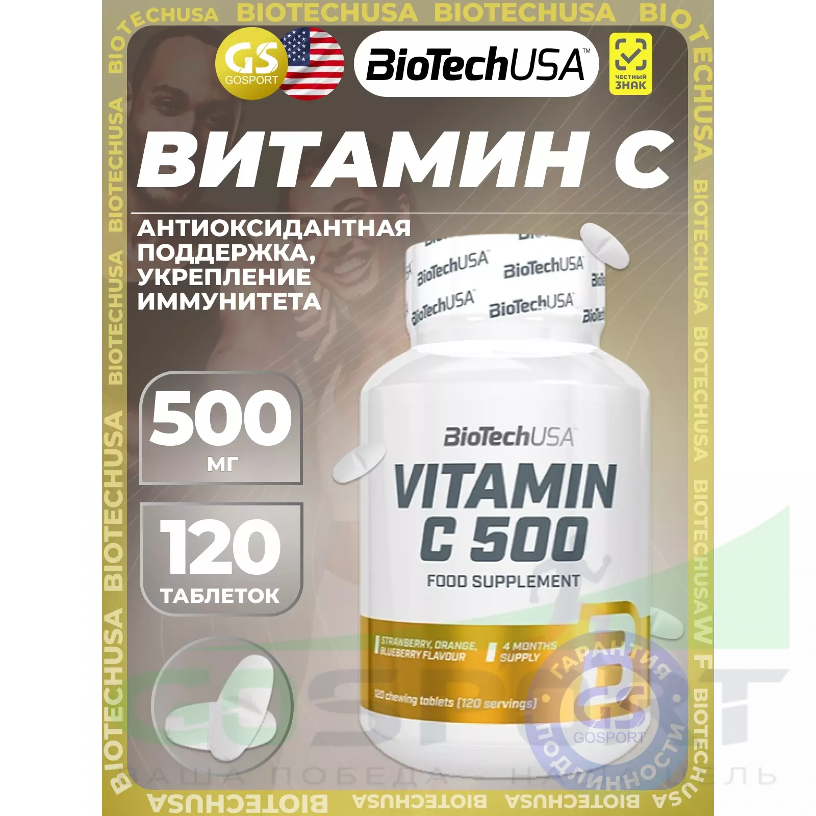 BioTechUSA Vitamin C 500 mg 120 жевательных таблеток, Клубника-апельсин-черника — Антиоксидантная поддержка, укрепление иммунитета