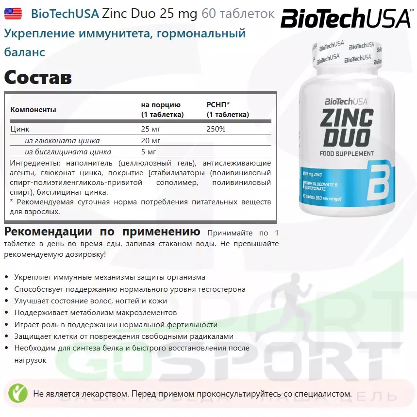 Описание BioTechUSA Zinc Duo 25 mg