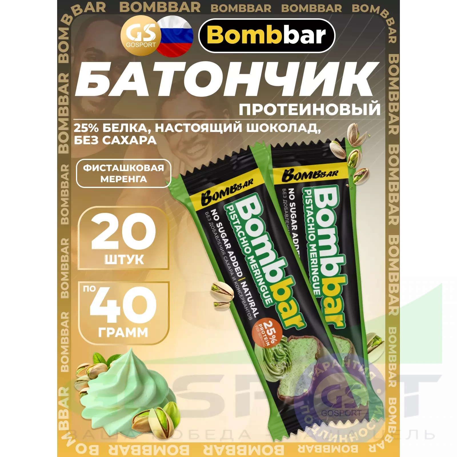 BombBar Батончик в шоколаде без сахара 20 x 40 г, Фисташковая меренга — Полезный и питательный перекус