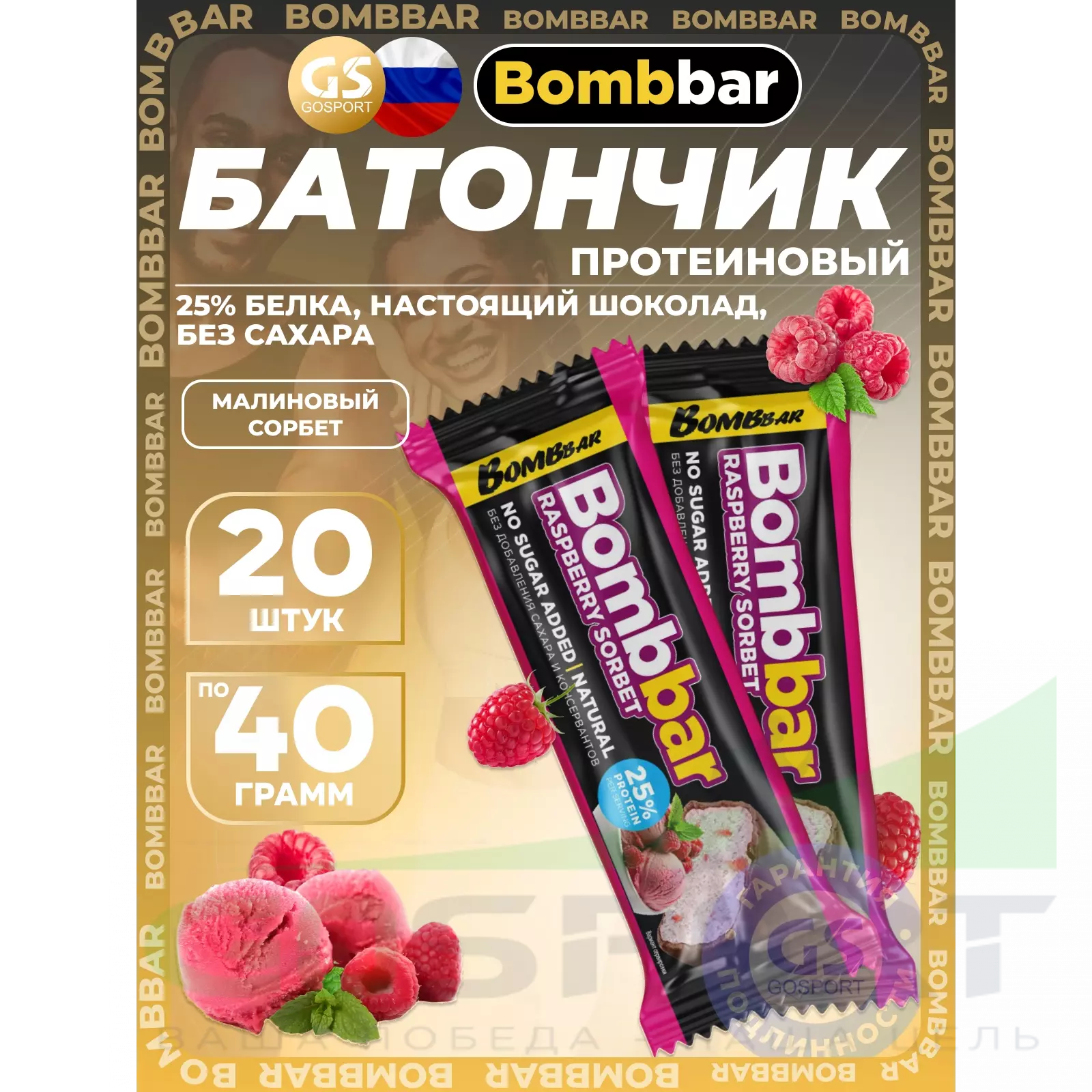 BombBar Батончик в шоколаде без сахара 20 x 40 г, Малиновый сорбет — Полезный и питательный перекус