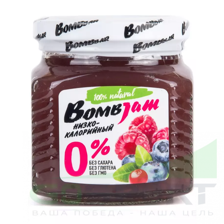 Джем BombJam 0% от BOMBBAR – это низкокалорийный джем, который добавит ярких вкусовых впечатлений в повседневный рацион и не повредит диете. В составе продукта отсутствует сахар, а калорийность практически равна нулю. В основе джема BombJam 0% Лесные ягода использованы настоящие ягоды - клюква, малина, черника.