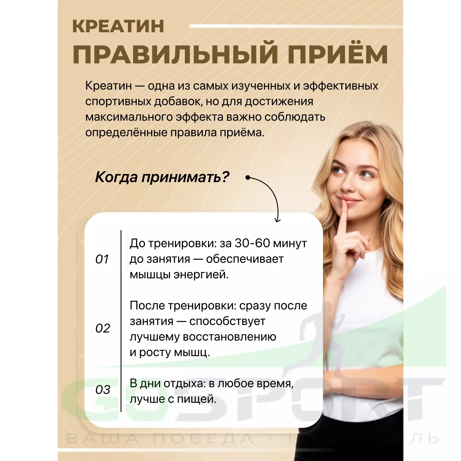 Так как он накапливается в мышцах - время приема не так важно, как систематичность. Креатин в форме порошка можно смешивать с соком (быстрые углеводы улучшают усвоение) или протеиновым коктейлем