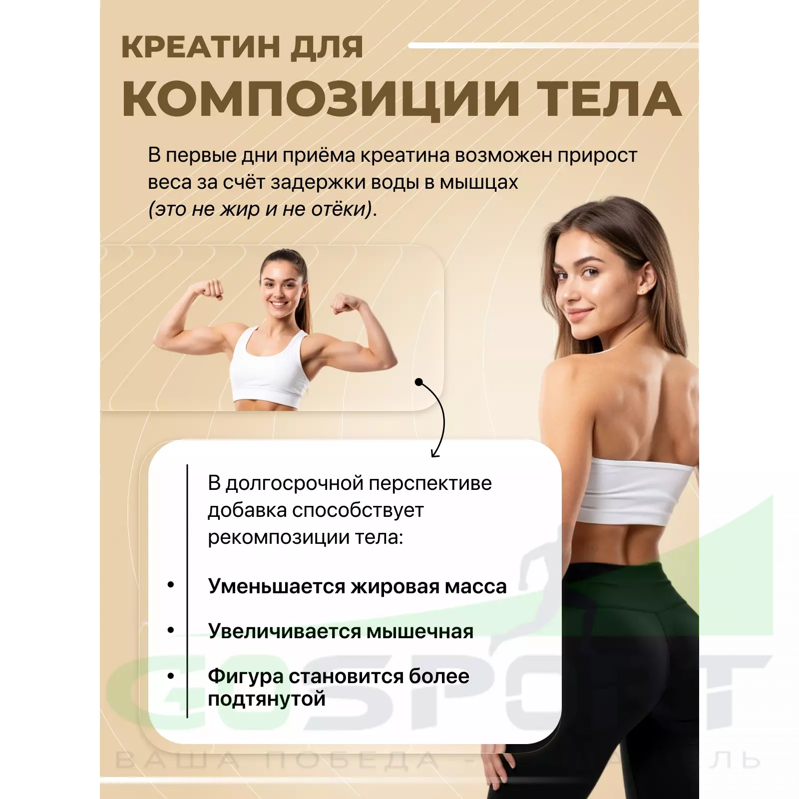- Способствует росту мышц – задерживает воду в мышечных клетках (саркоплазматическая гипертрофия), создавая эффект "наполненности" и стимулируя синтез белка для набора веса.