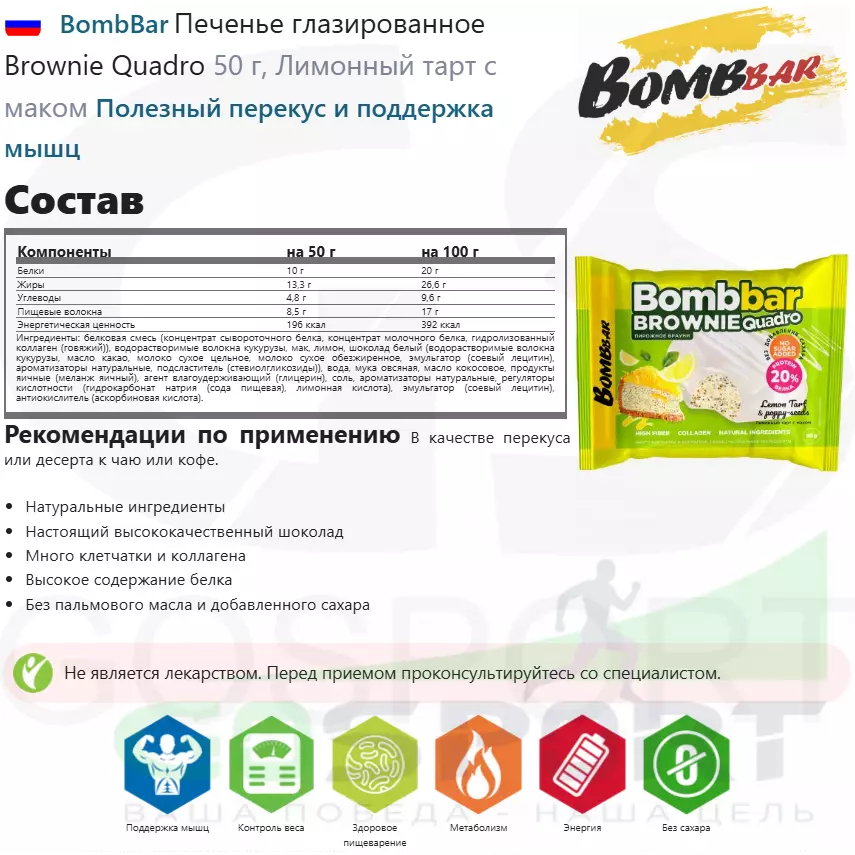 BombBar Печенье глазированное Brownie Quadro 50 г, Лимонный тарт с маком — Полезный перекус и поддержка мышц