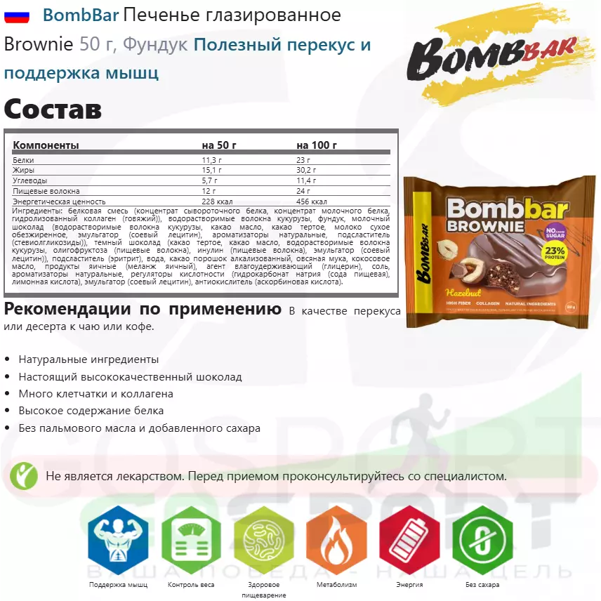 BombBar Печенье глазированное Brownie 10 x 50 г, Фундук — Полезный перекус и поддержка мышц