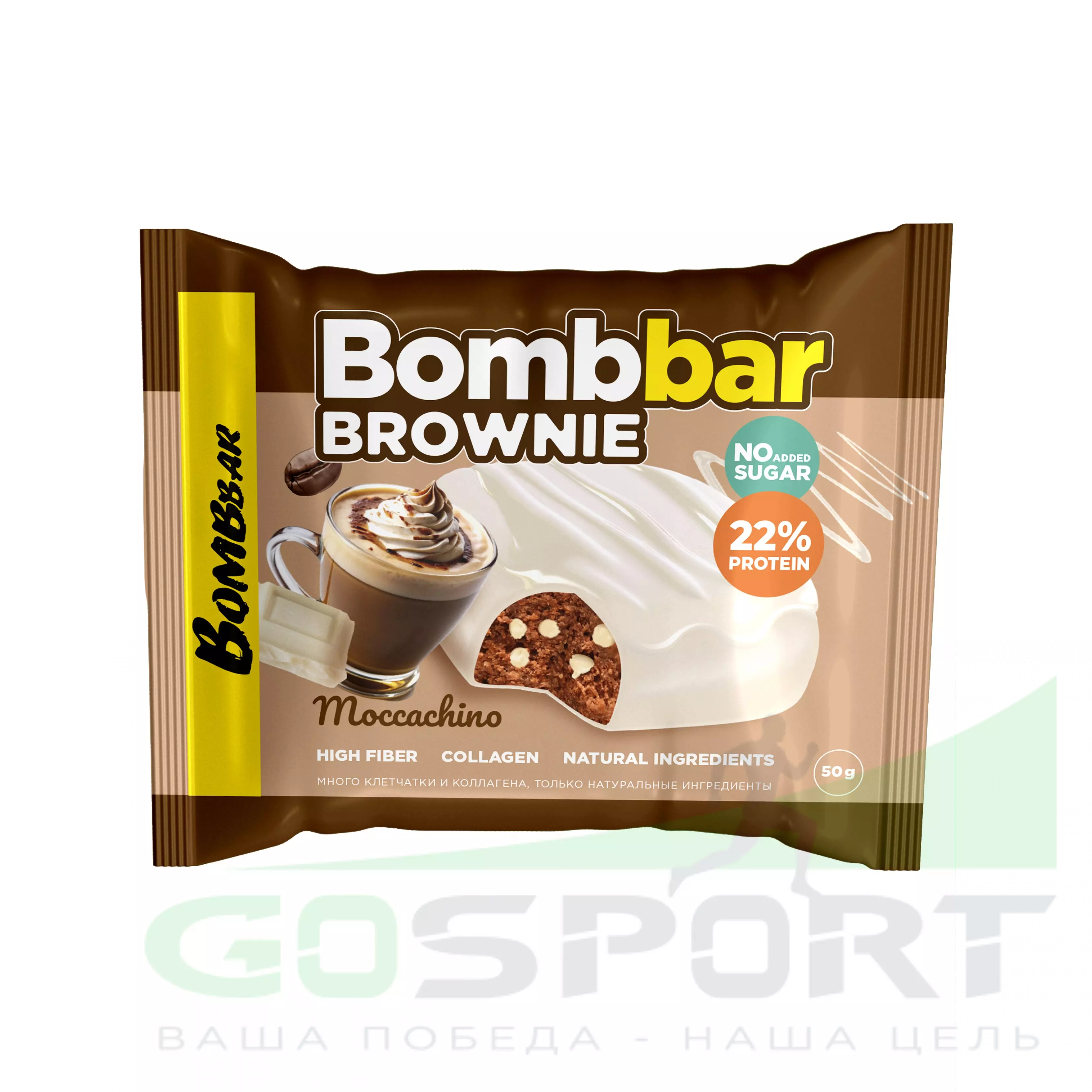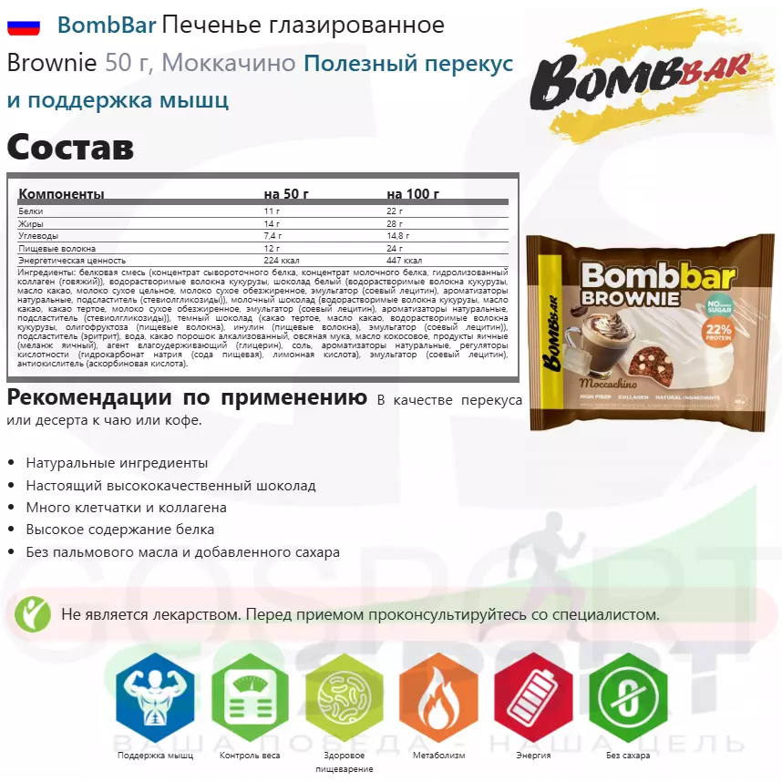 BombBar Печенье глазированное Brownie 10 x 50 г, Моккачино — Полезный перекус и поддержка мышц