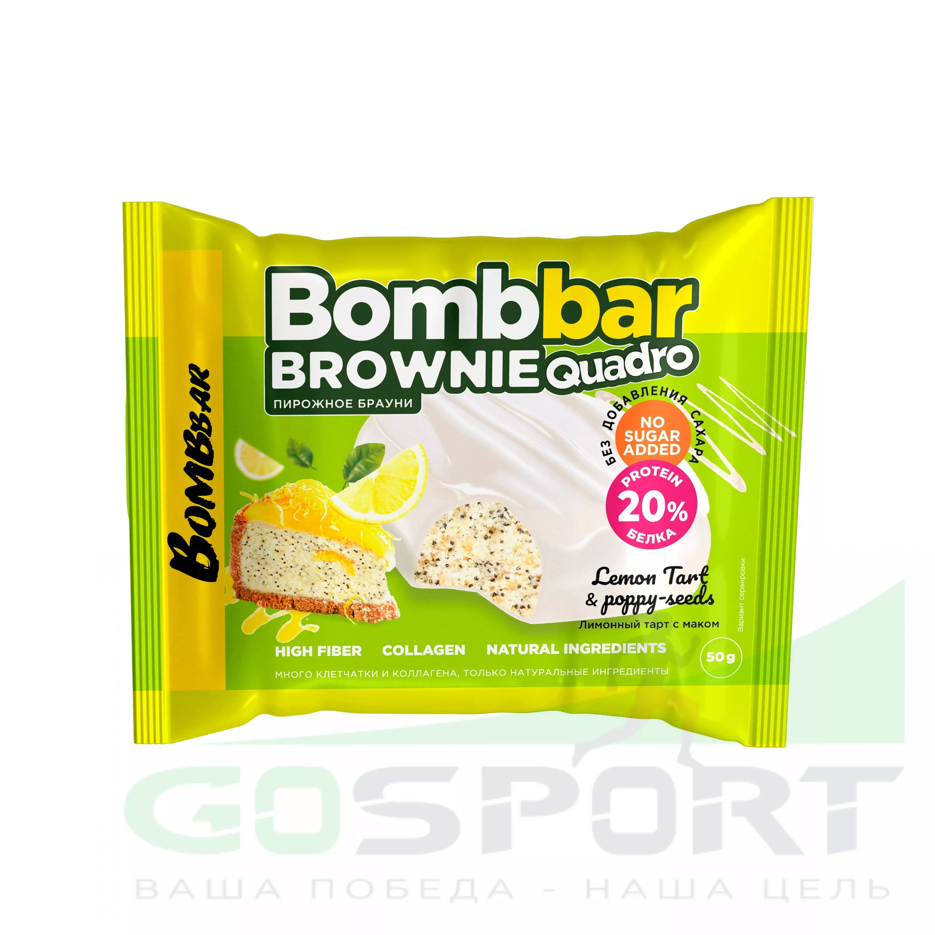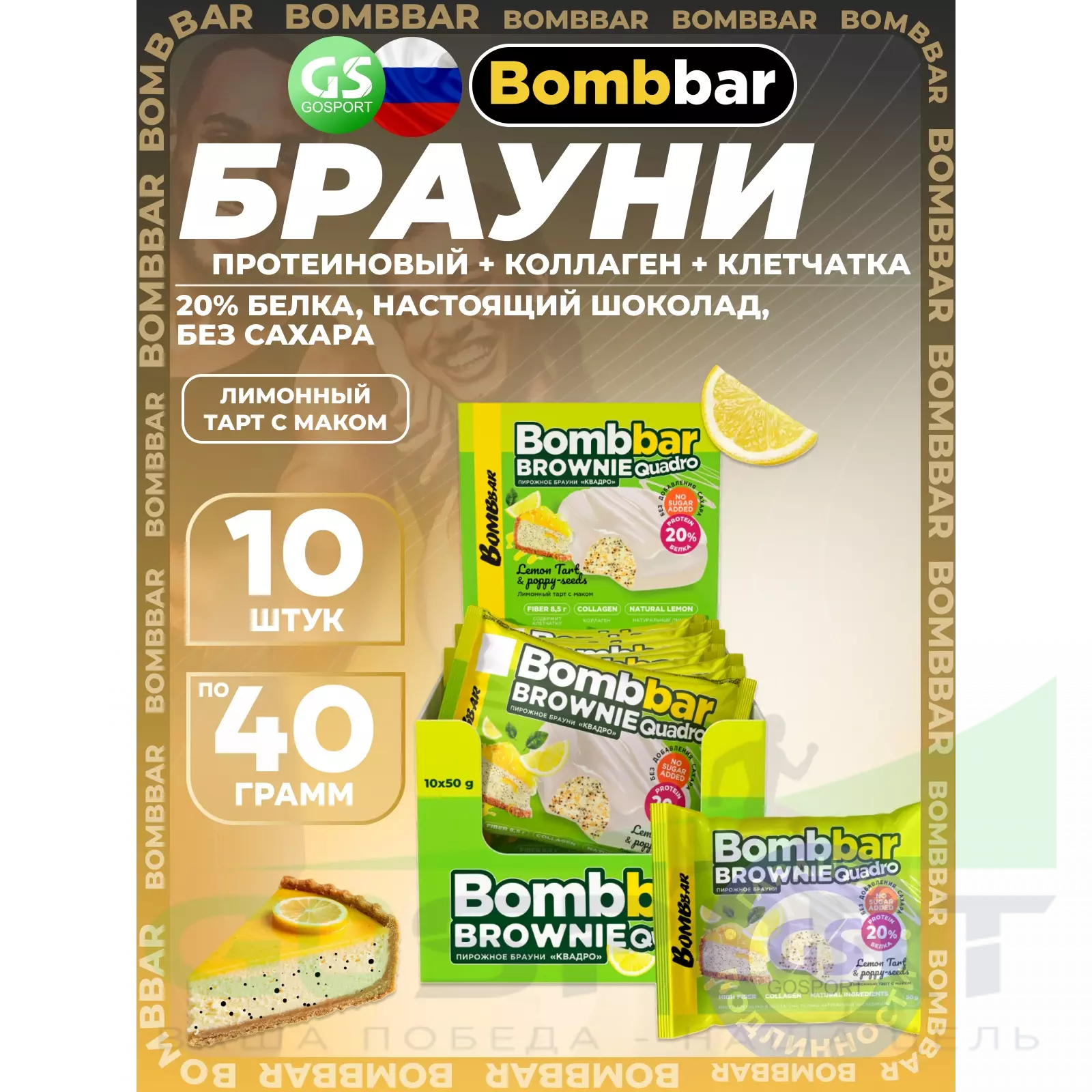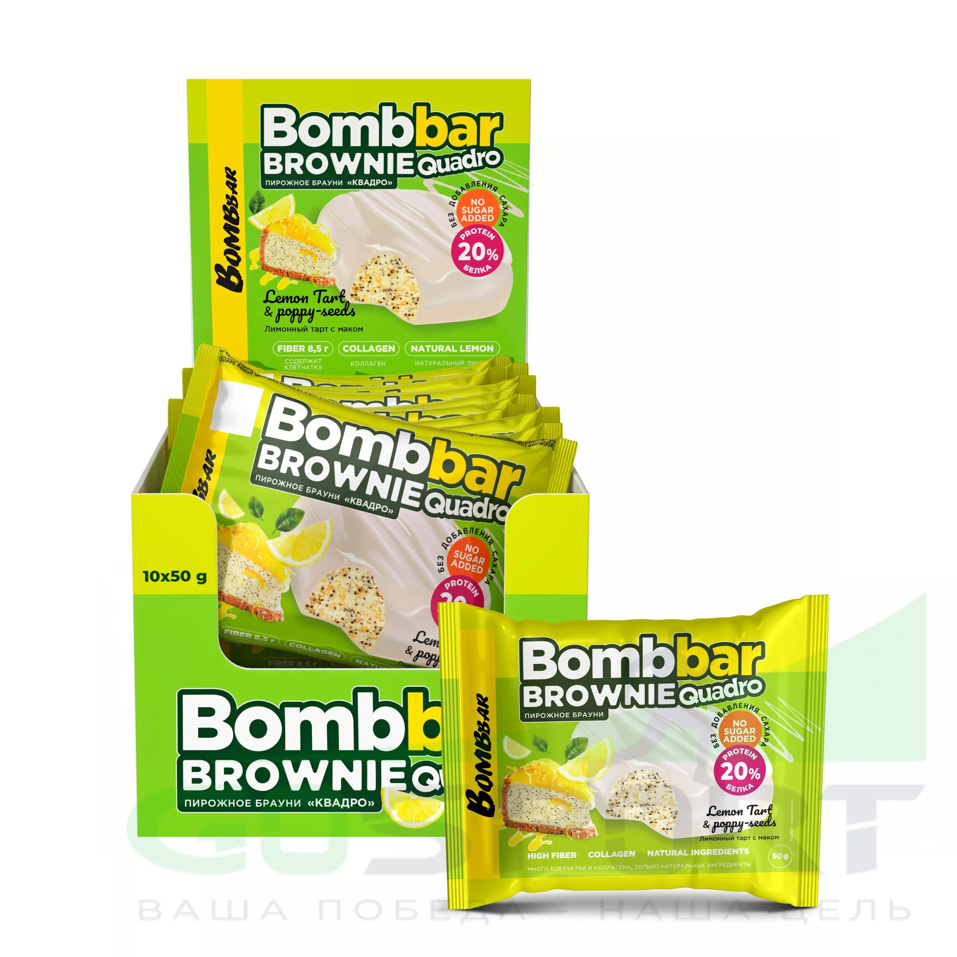 BombBar Печенье глазированное Brownie Quadro 10 x 50 г, Лимонный тарт с маком — Полезный перекус и поддержка мышц