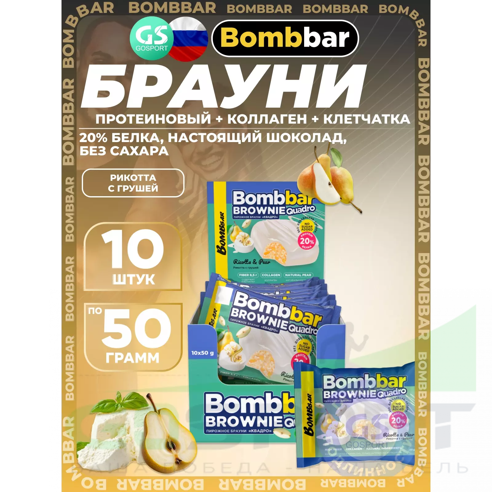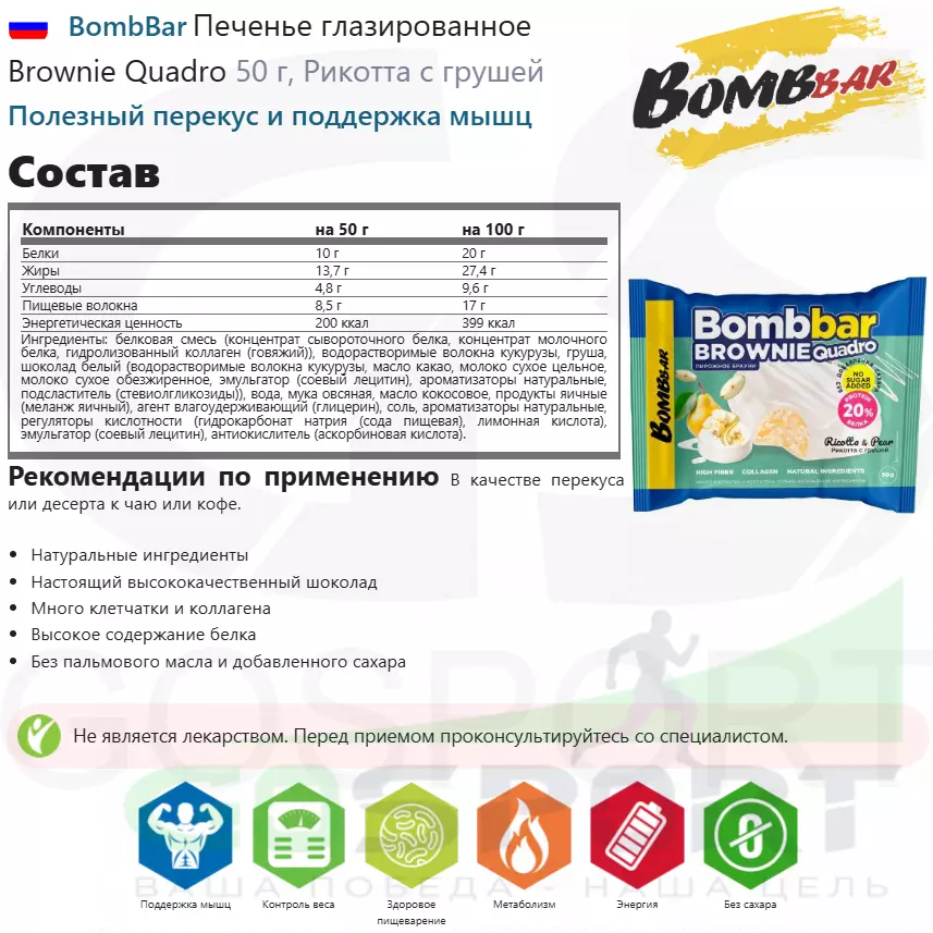 BombBar Печенье глазированное Brownie Quadro 10 x 50 г, Рикотта с грушей — Полезный перекус и поддержка мышц