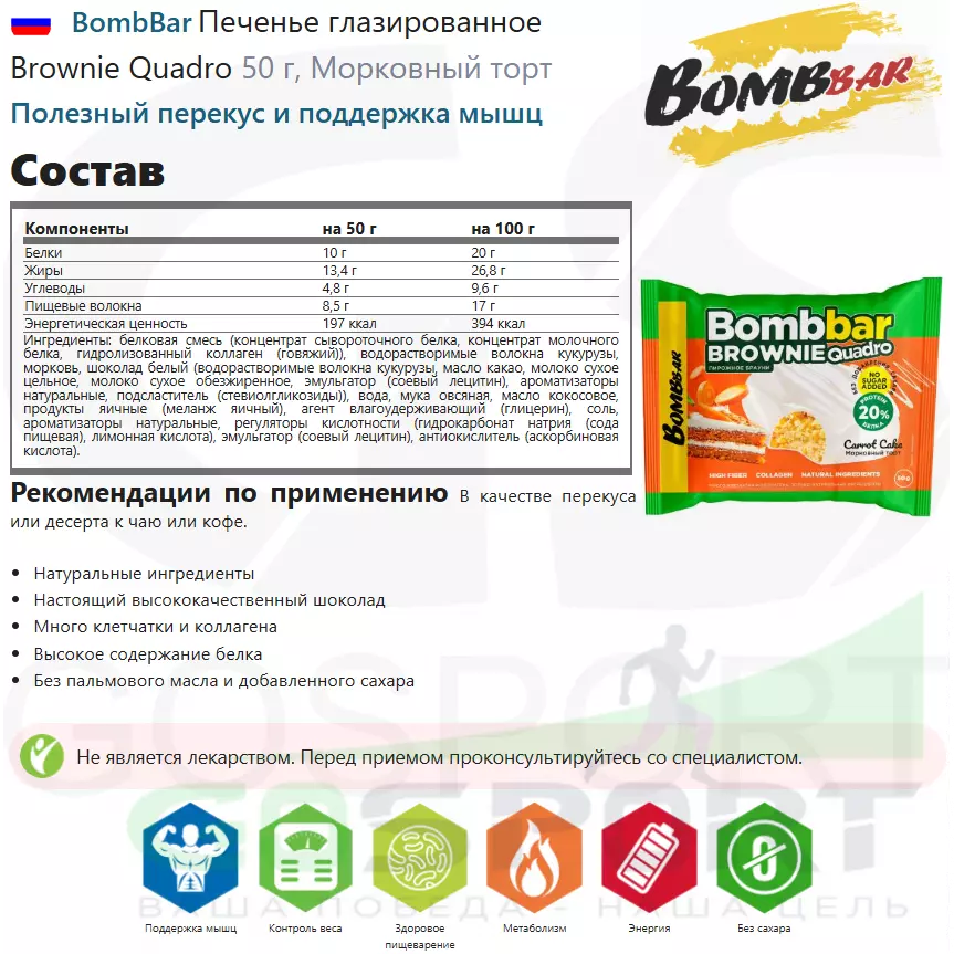 BombBar Печенье глазированное Brownie Quadro 10 x 50 г, Морковный торт — Полезный перекус и поддержка мышц