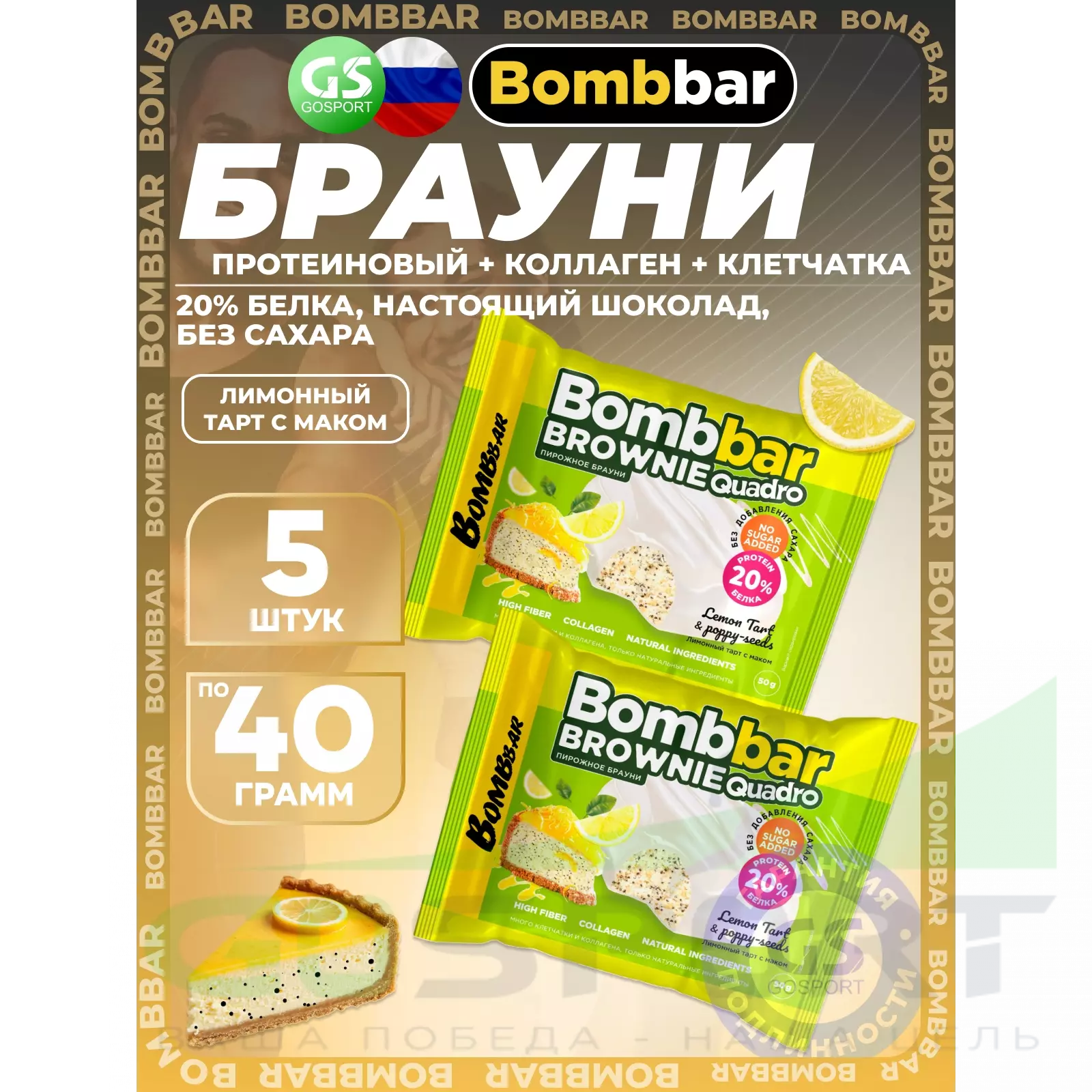 BombBar Печенье глазированное Brownie Quadro 5 x 40 г, Лимонный тарт с маком — Полезный перекус и поддержка мышц