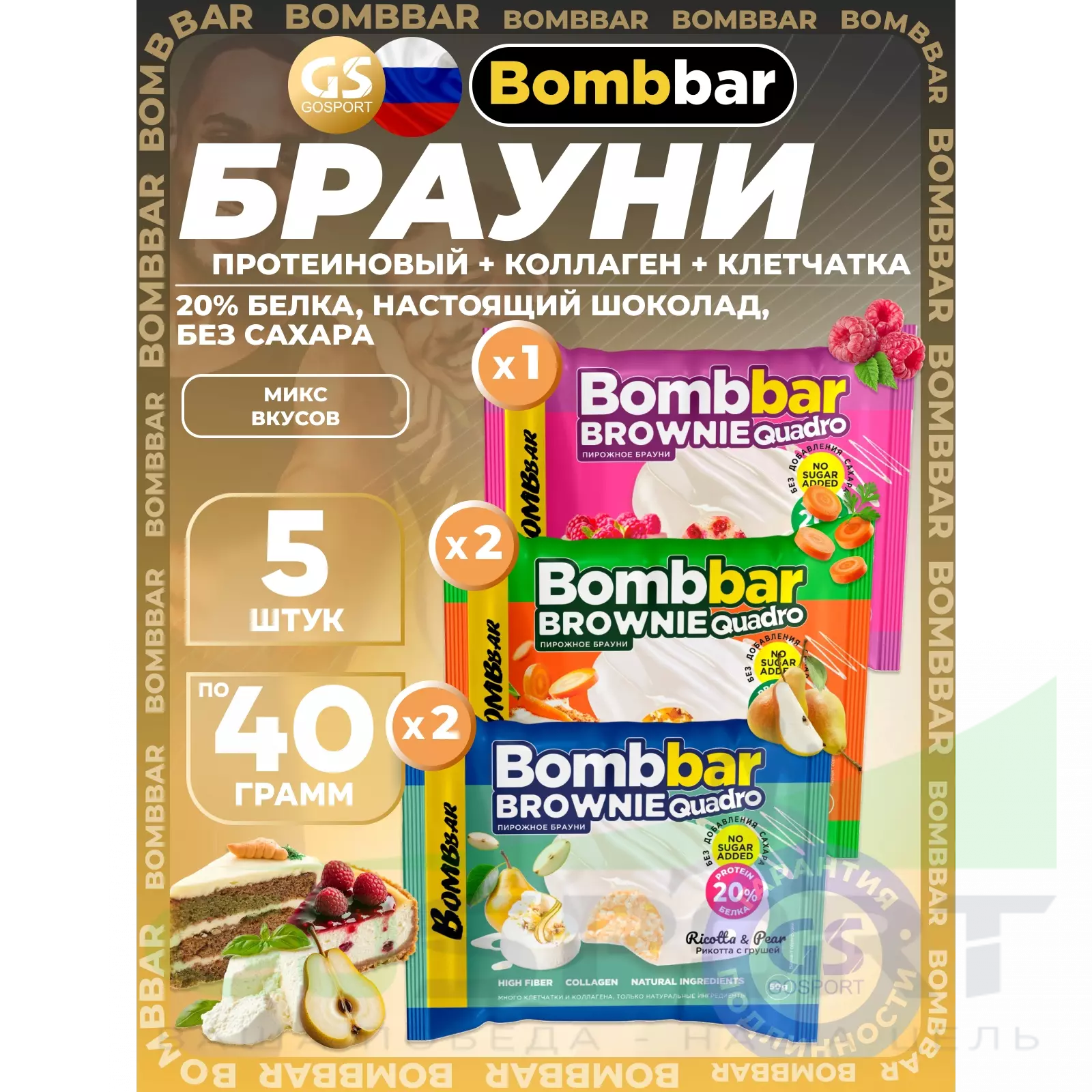 BombBar Печенье глазированное Brownie Quadro 5 x 40 г, Микс 3 — Полезный перекус и поддержка мышц