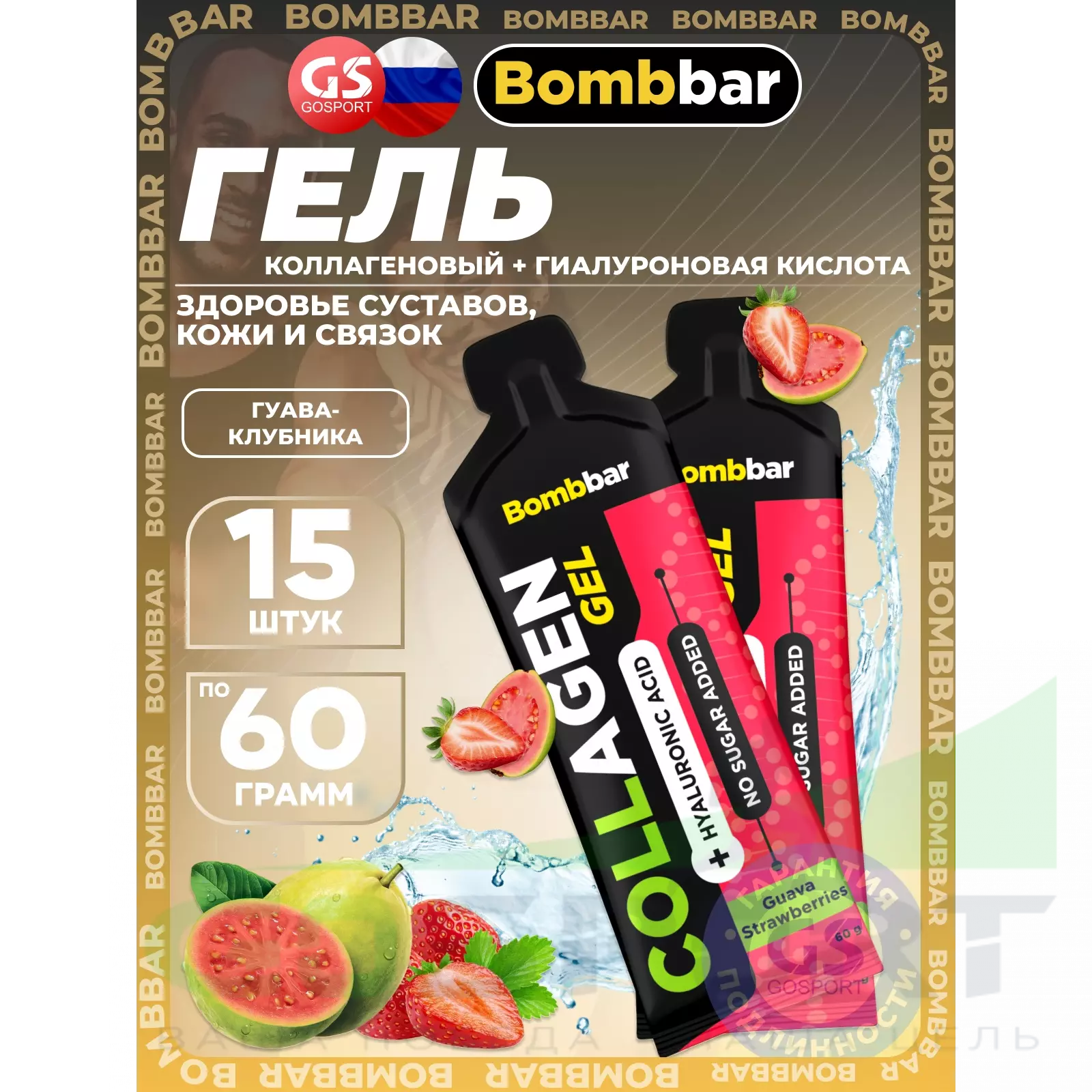 BombBar Collagen gel 5000 mg + hyaluronic acid 15 x 60 г, Гуава-Клубника — Здоровье суставов, кожи и связок