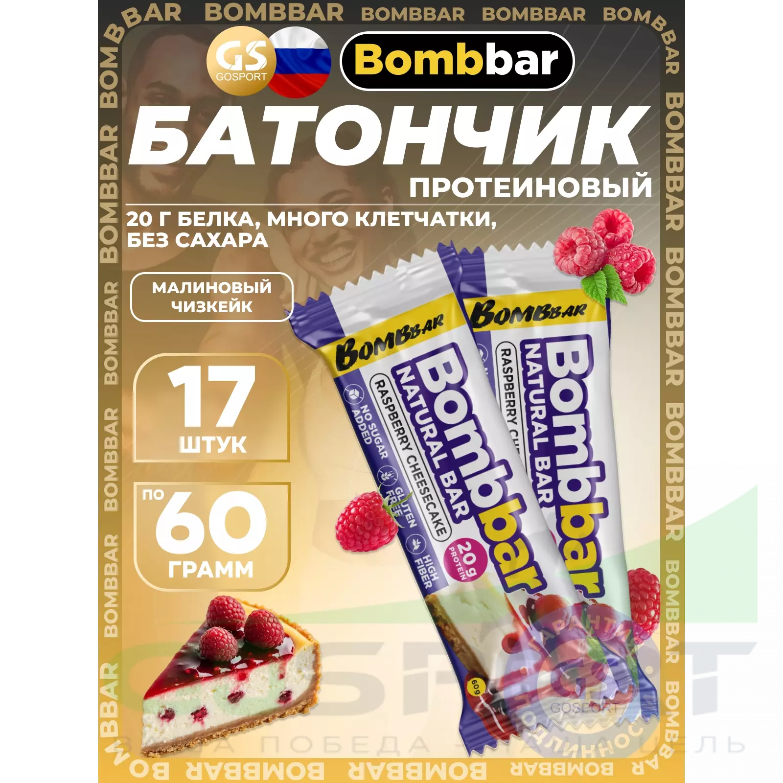 BombBar Protein Bar 17 x 60 г, Малиновый чизкейк — Полезный перекус и поддержка мышц