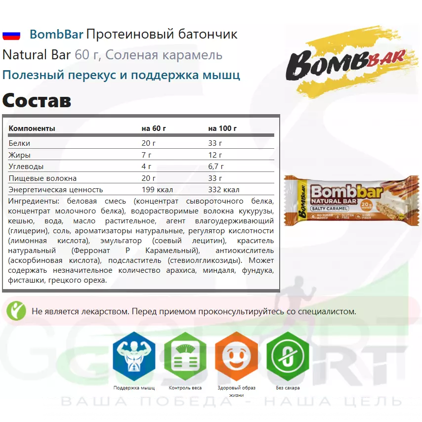 Почему именно Bombbar? BombBar отличает уникальный состав из натурального высококачественного сырья и, конечно, великолепный вкус. Продукция BombBar соответствует требованиям Халяль и имеет соответствующий сертификат. Забудь про вредное и калорийное сладкое! Вкусняшки BombBar делают каждый приём пищи полезным и вкусным. Вместе с BombBar достигать спортивных успехов становится легче!