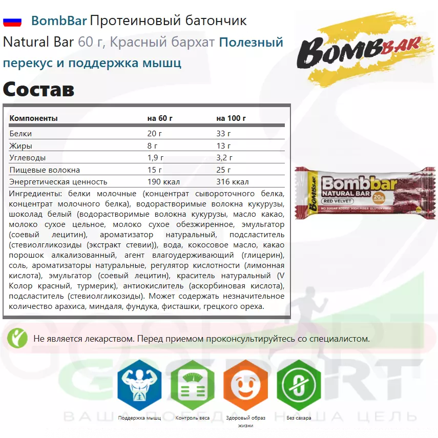 Поздравляем, вы выбрали правильный продукт - идеальный перекус для любой ситуации! Ведь это не просто сладкое - это спорт пит высокого качества, который поможет соблюсти все нормы пп рациона. Нет места для компромиссов - BombBar использует только лучшие ингредиенты и высококачественные компоненты. Попробуйте протеиновые батончики BombBar, чтобы узнать, как полезно и вкусно может быть здоровое питание!