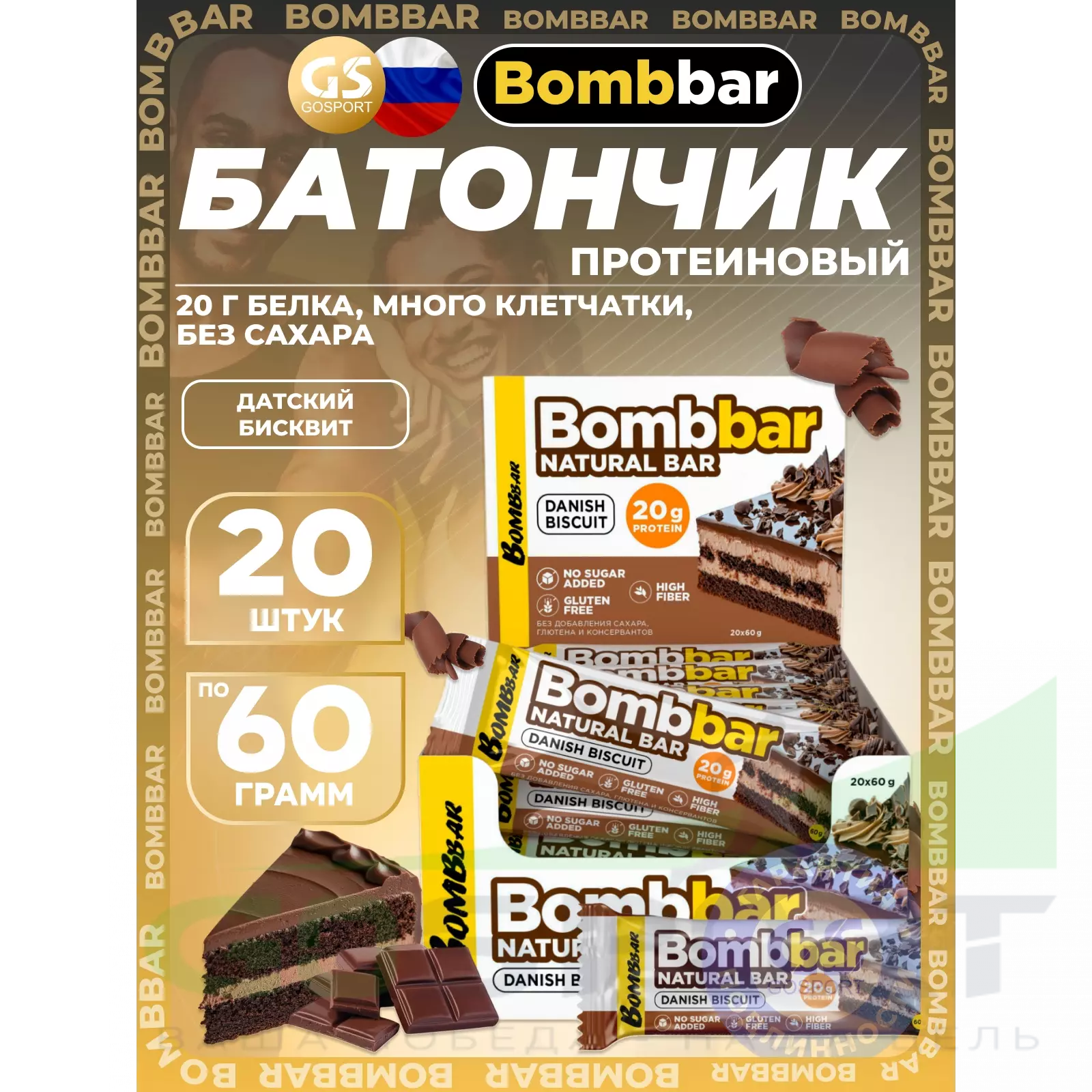 BombBar Protein Bar 20 x 60 г, Датский бисквит — Полезный перекус и поддержка мышц