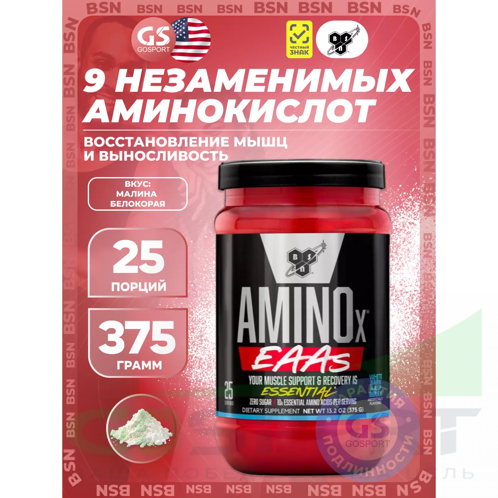 Каждая порция в AMINOX EAAS от BSN содержит в сумме 10 г всех девяти EAA, 5 г из трех важнейших BCAA, а остальные 5 г из оставшихся шести EAA. Эти EAA являются основной особенностью продукта, без дополнительного таурина или цитруллина, как в текущей и обычной версии AminoX.