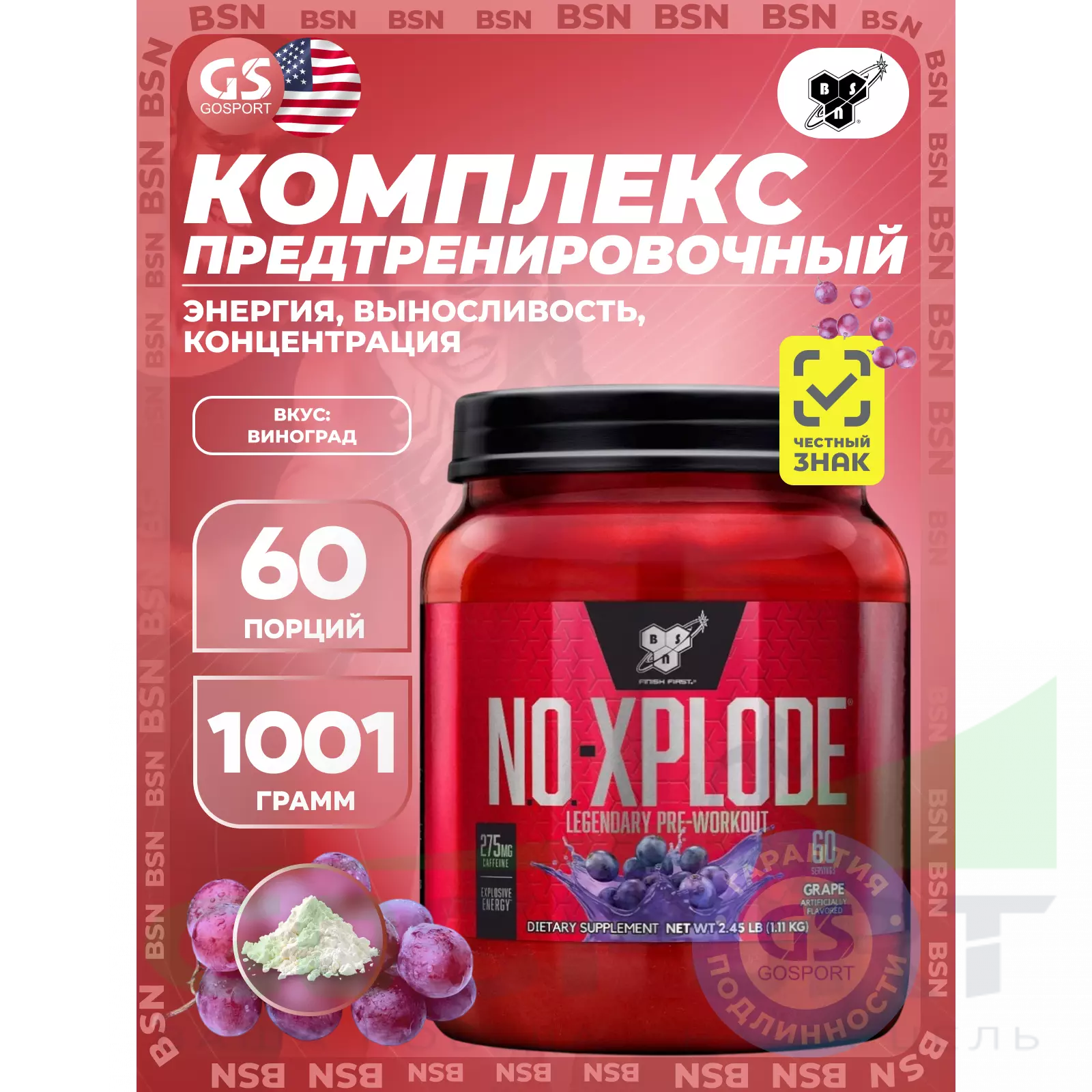 Для проведения наиболее эффективной тренировки необходимы, как ментальная, так и физическая энергия. Сосредоточенность нужна для контроля над энергией и управления сильной мышечно-мозговой связью. Эта мышечно-мозговая связь помогает достичь Вам большей интенсивности на тренировках и дает толчок организму к преодолению старых пределов. В BSN мы знаем, что предтренировочный комплекс должен обладать всеми этими возможностями. Мы разработали NO-XPLODE, полноценный предтренировочный комплекс, для помощи в получении большей энергии и выпосливости, поддержки мозгового центра и мышечной силы, а также чтобы дать вам непревзойденную интенсивность для достижения атлетами любого уровня максимальной работоспособности на тренировках.