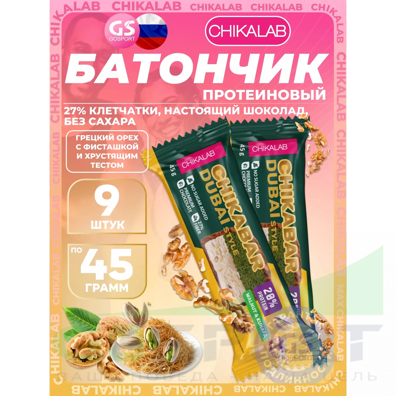 Chikalab Батончик глазированный Chikabar Dubai 9 x 45 г, Грецкий орех с фисташкой и хрустящим тестом — Полезный и питательный перекус
