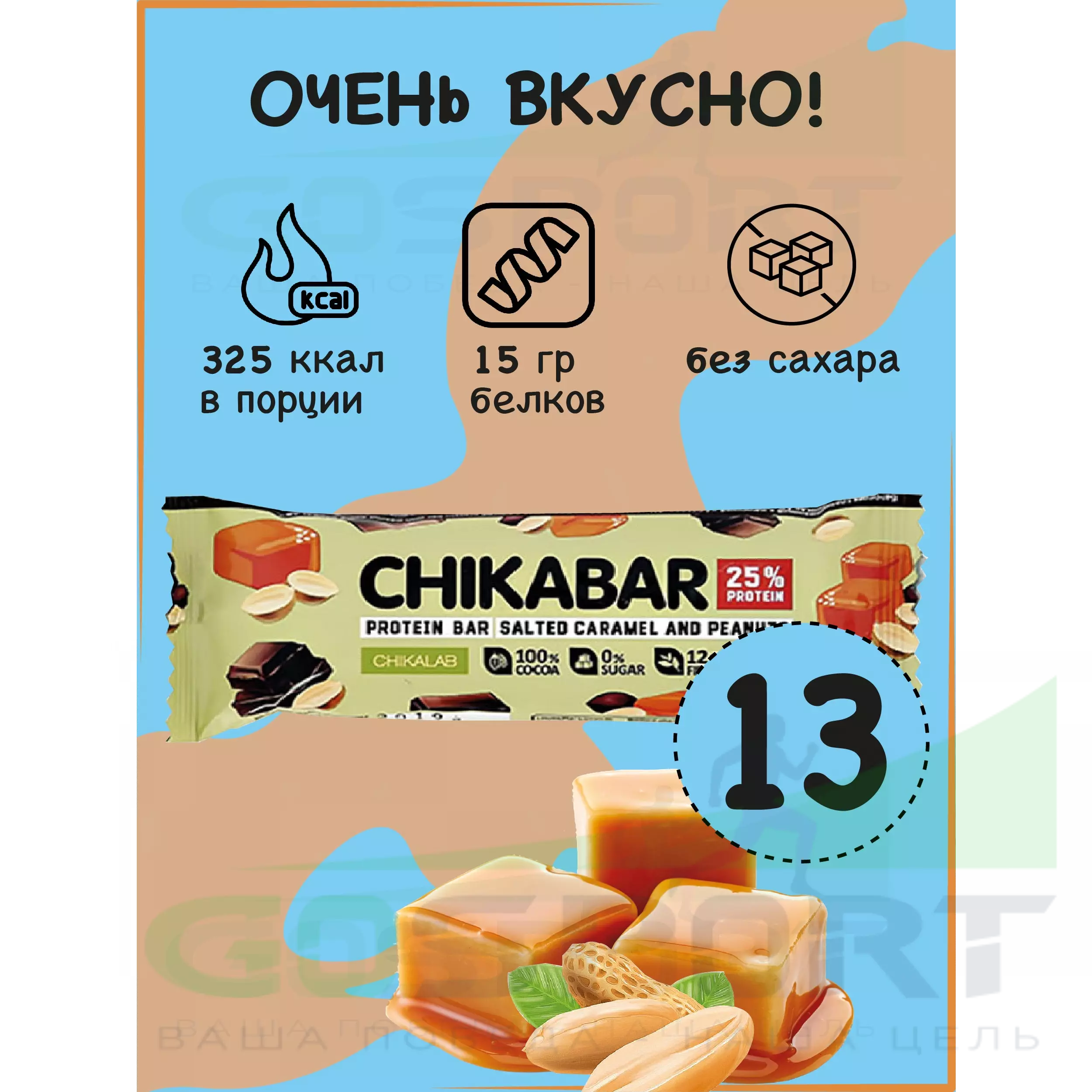 Chikabar 13 батончиков x 60 г, Арахис с карамельной начинкой