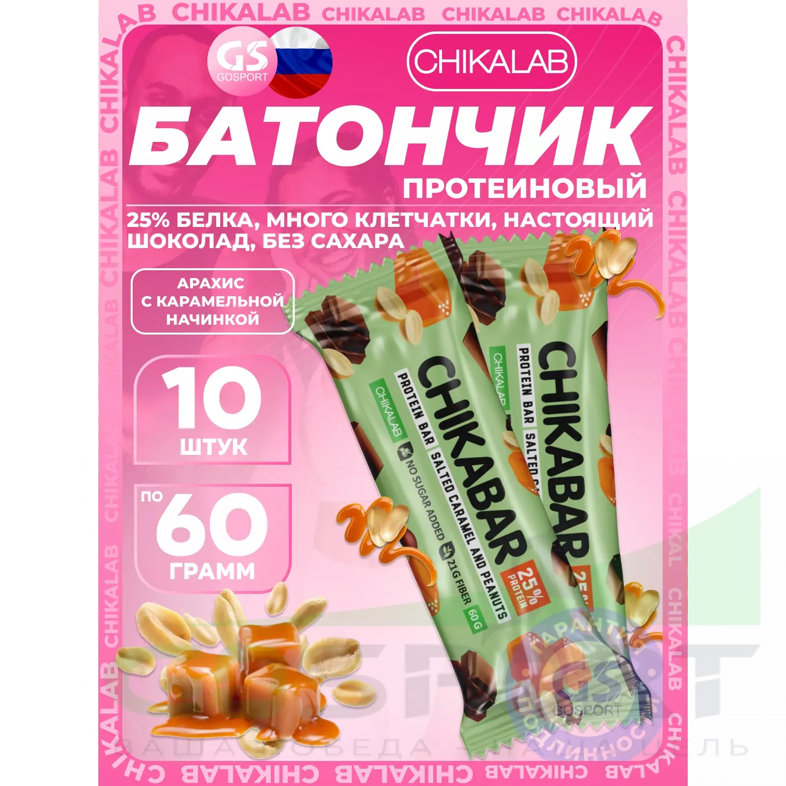 Chikalab Chikabar 10 x 60 г, Соленая карамель и арахис — Полезный перекус и поддержка мышц