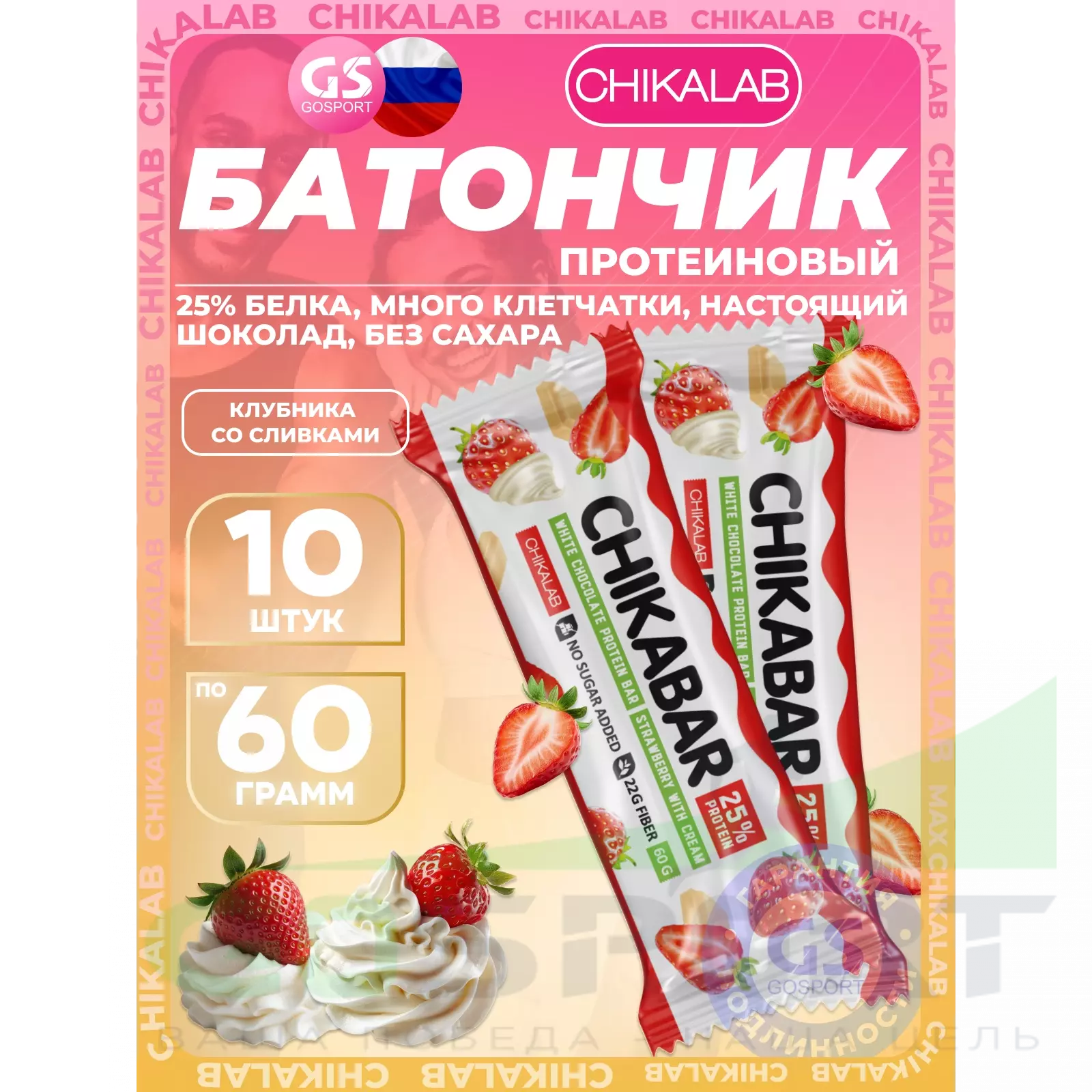 Chikalab Chikabar 10 x 60 г, Клубника со сливками — Полезный перекус и поддержка мышц