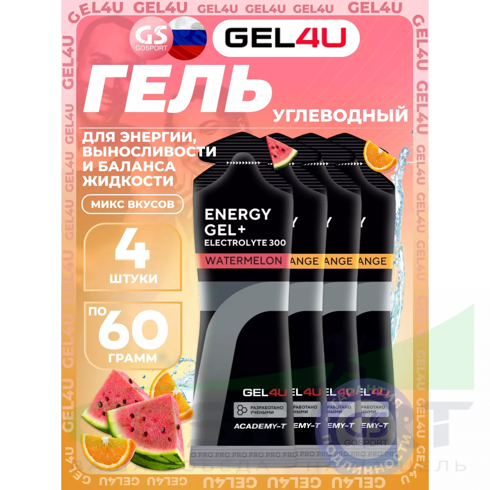 GEL4U Energy Gel MIX 4 x 60 г, Апельсин, Соленый Арбуз — Энергия, выносливость и баланс жидкости