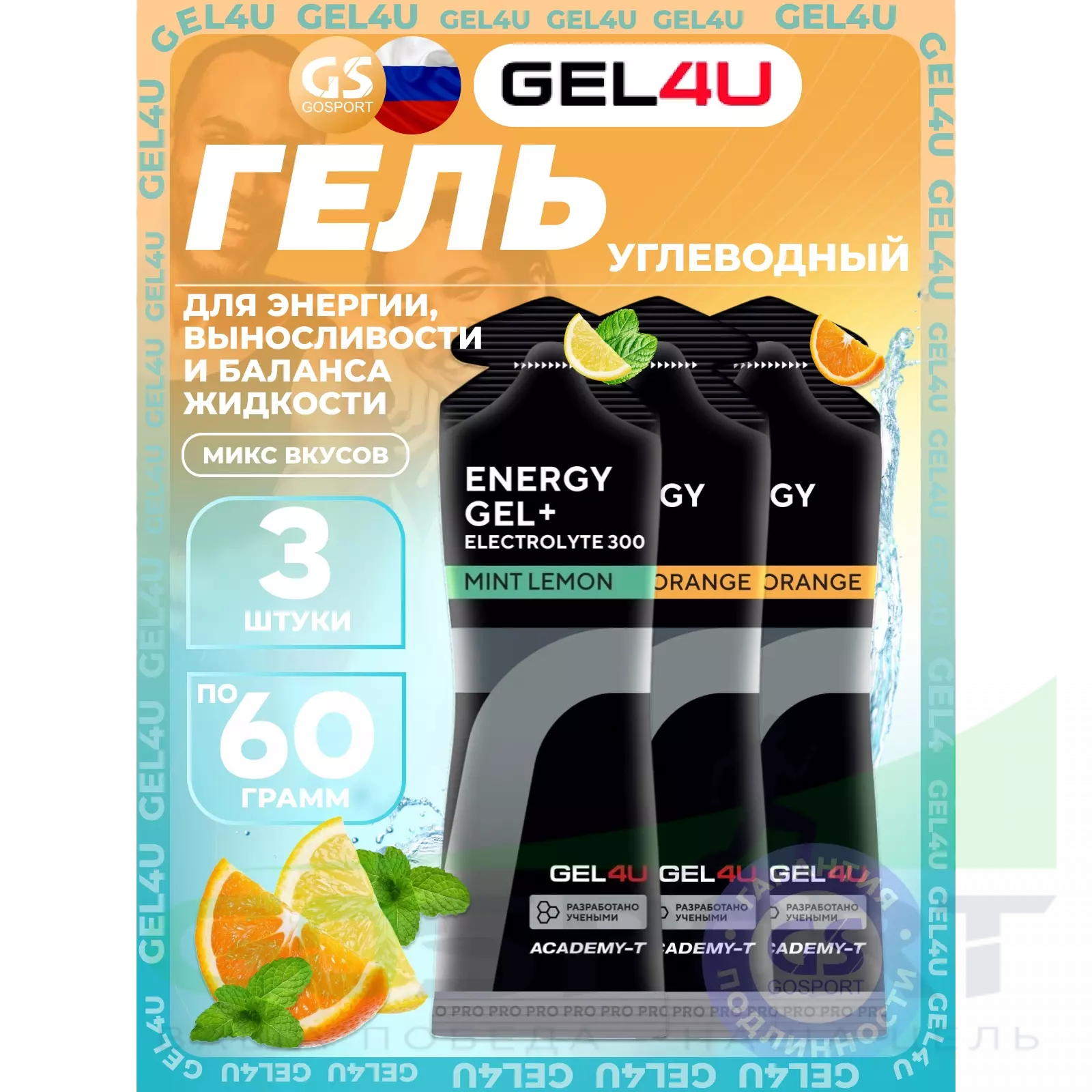 GEL4U Energy Gel MIX 3 x 60 г, Апельсин, Лимон и Мята — Энергия, выносливость и баланс жидкости
