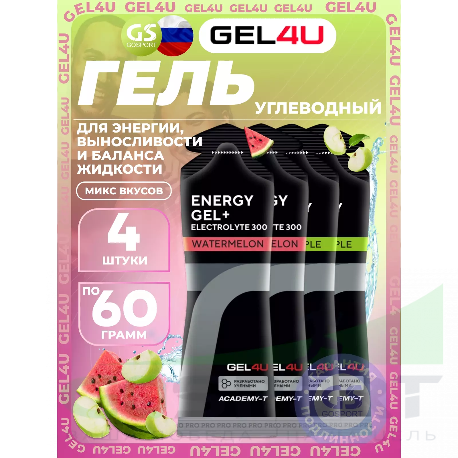 GEL4U Energy Gel MIX 4 x 60 г, Яблоко, Арбуз — Энергия, выносливость и баланс жидкости